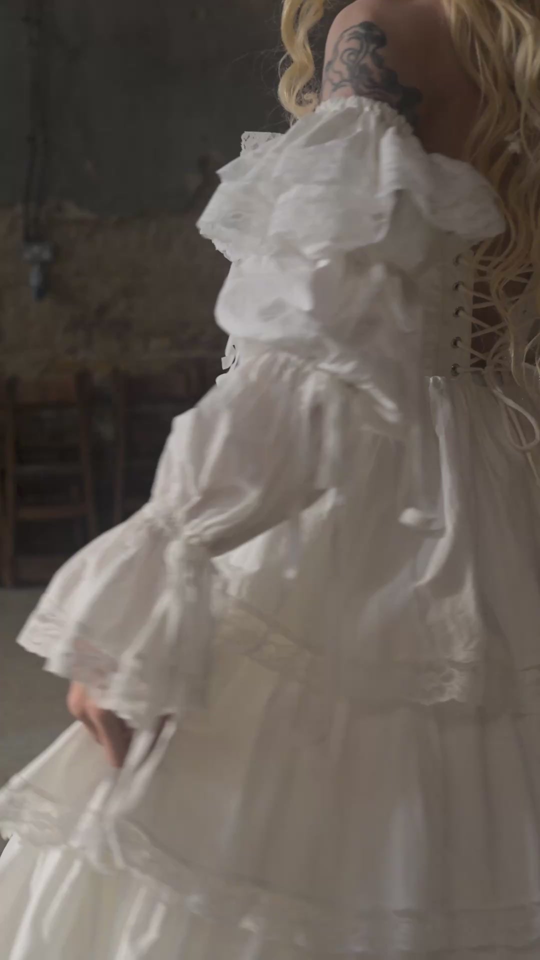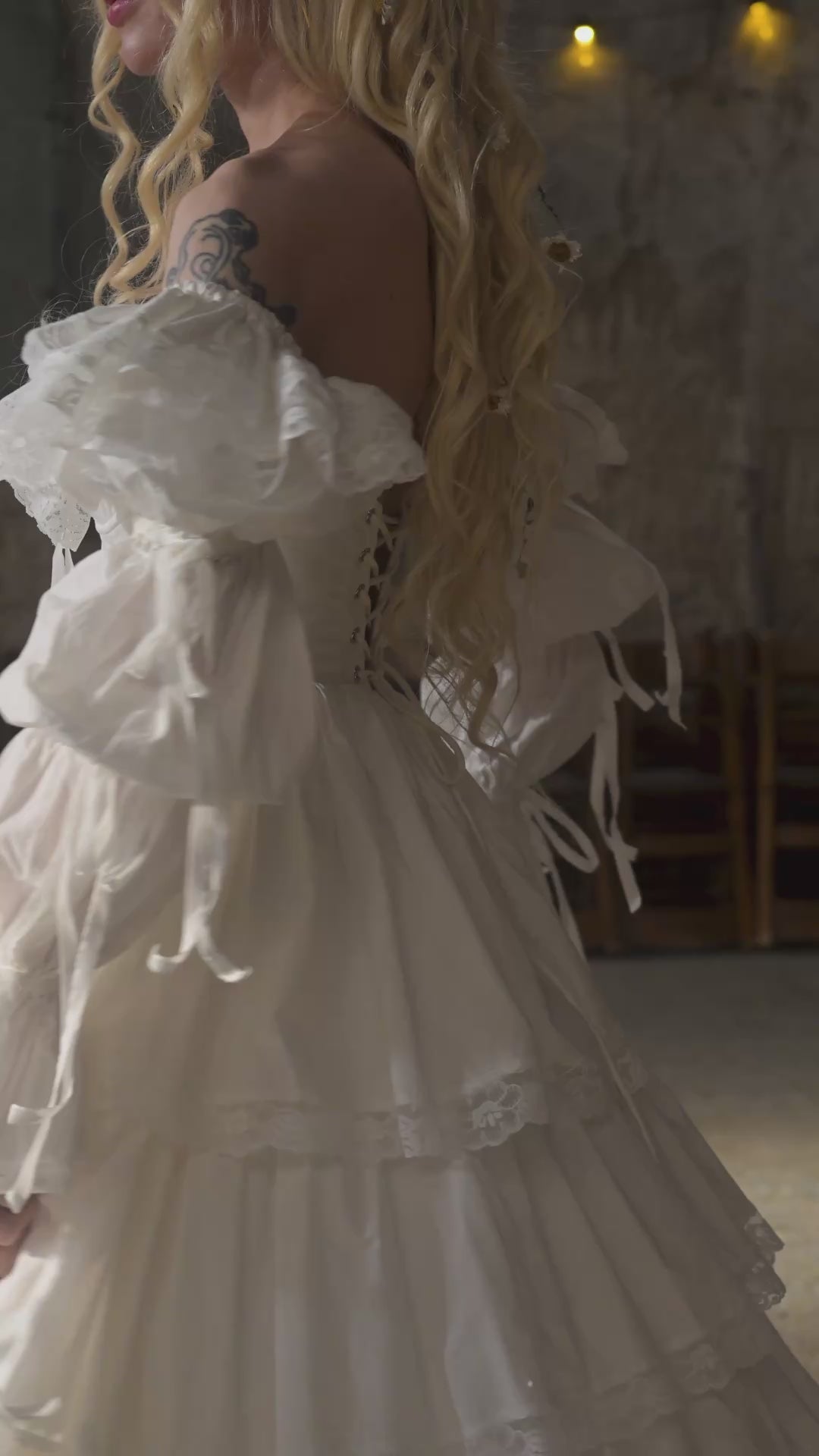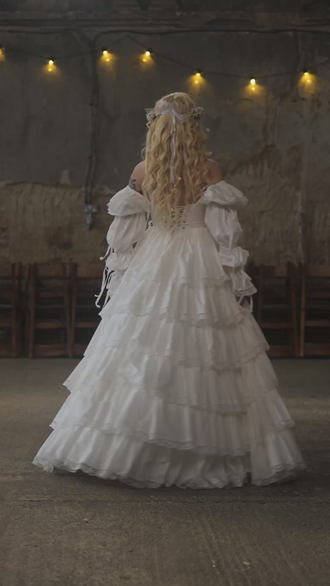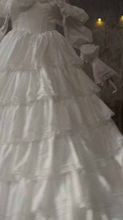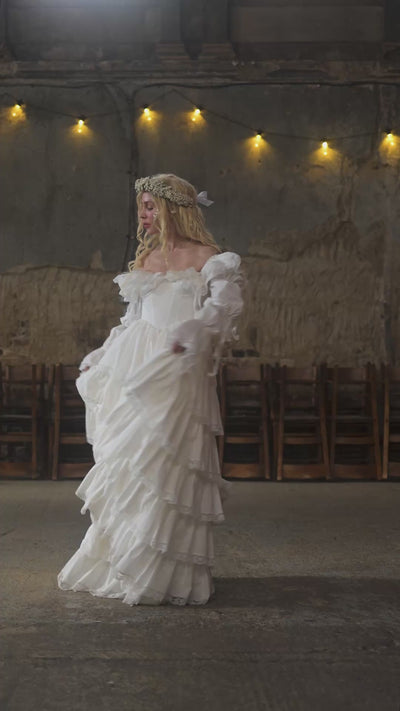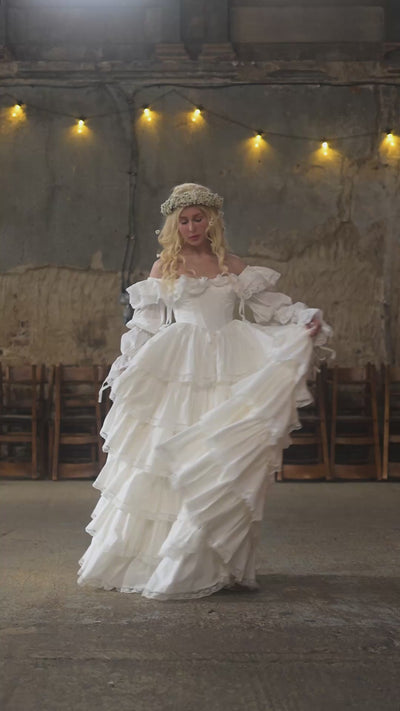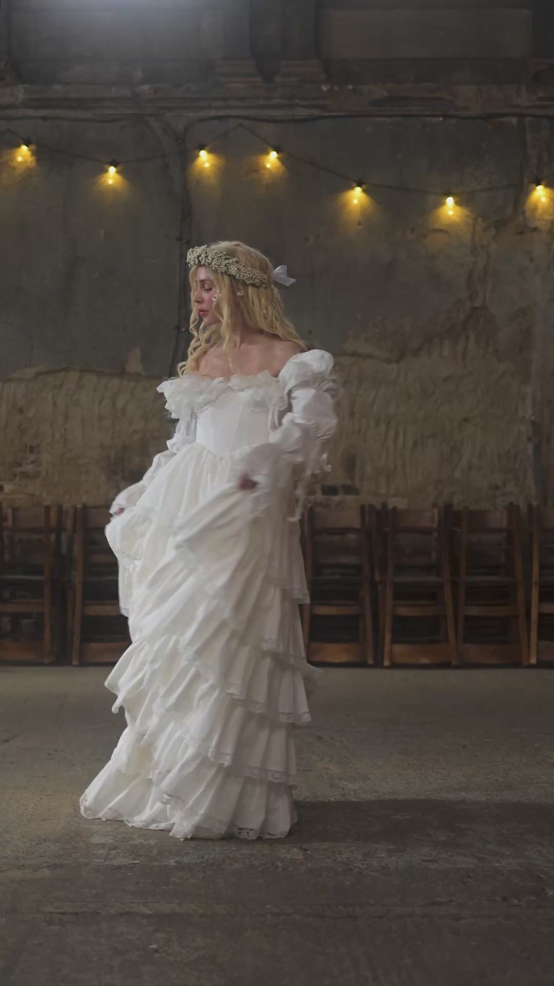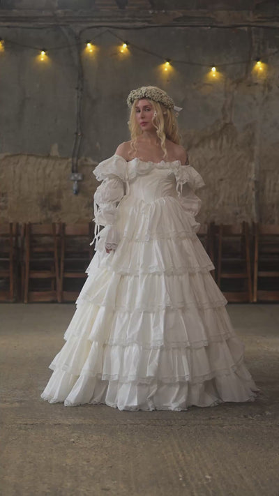 Step back in time with the enchanting Age of Innocence Bridal Gown. This Southern Belle-inspired masterpiece features a tiered skirt with delicate lace trims, long sleeves, and a bardot neckline that exude a captivating sense of innocence and demure elegance. Velveteen ribbons and an ivory shade complete the vintage-inspired look, perfect for the harvest wedding of your dreams.