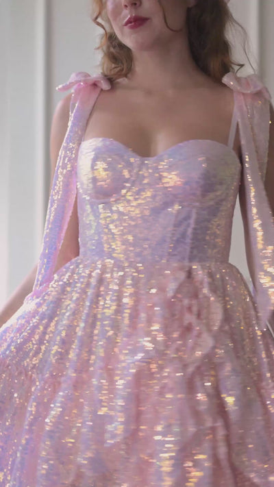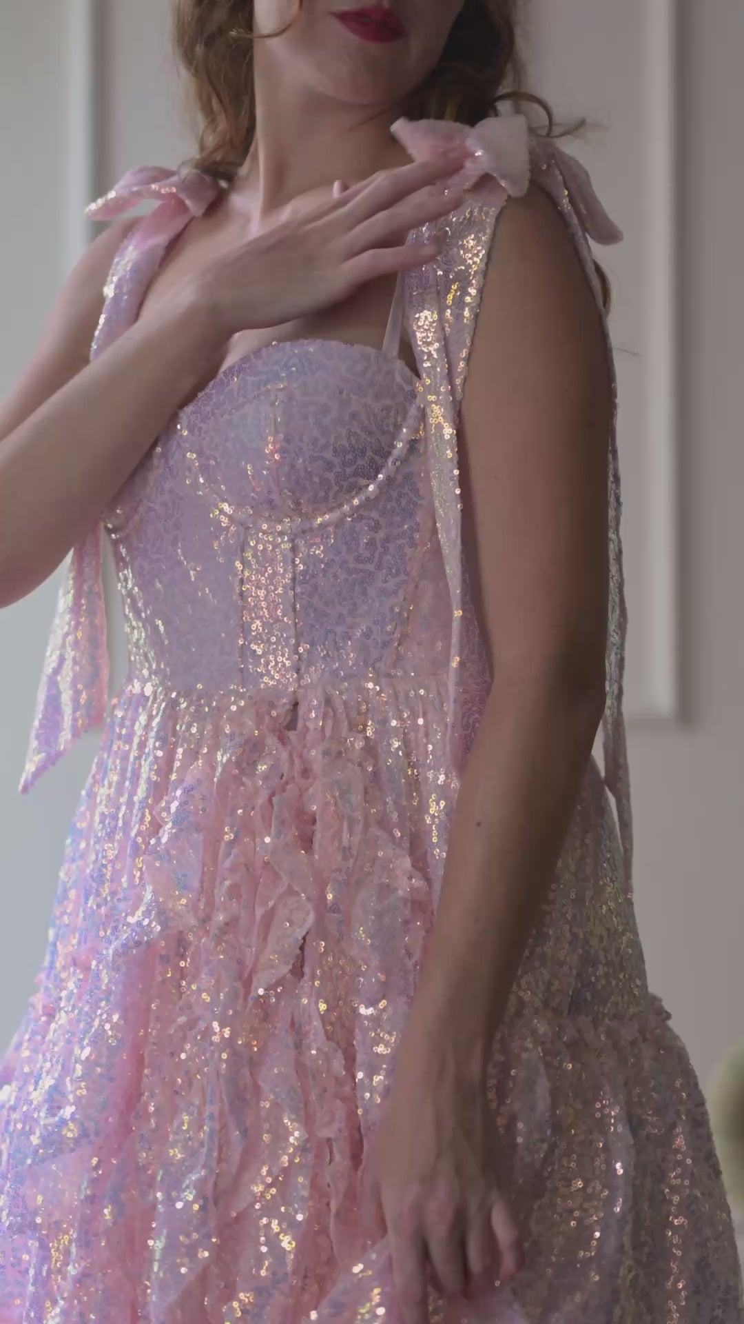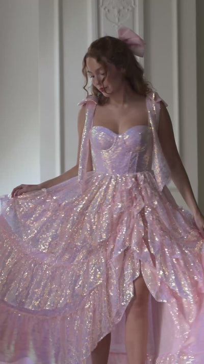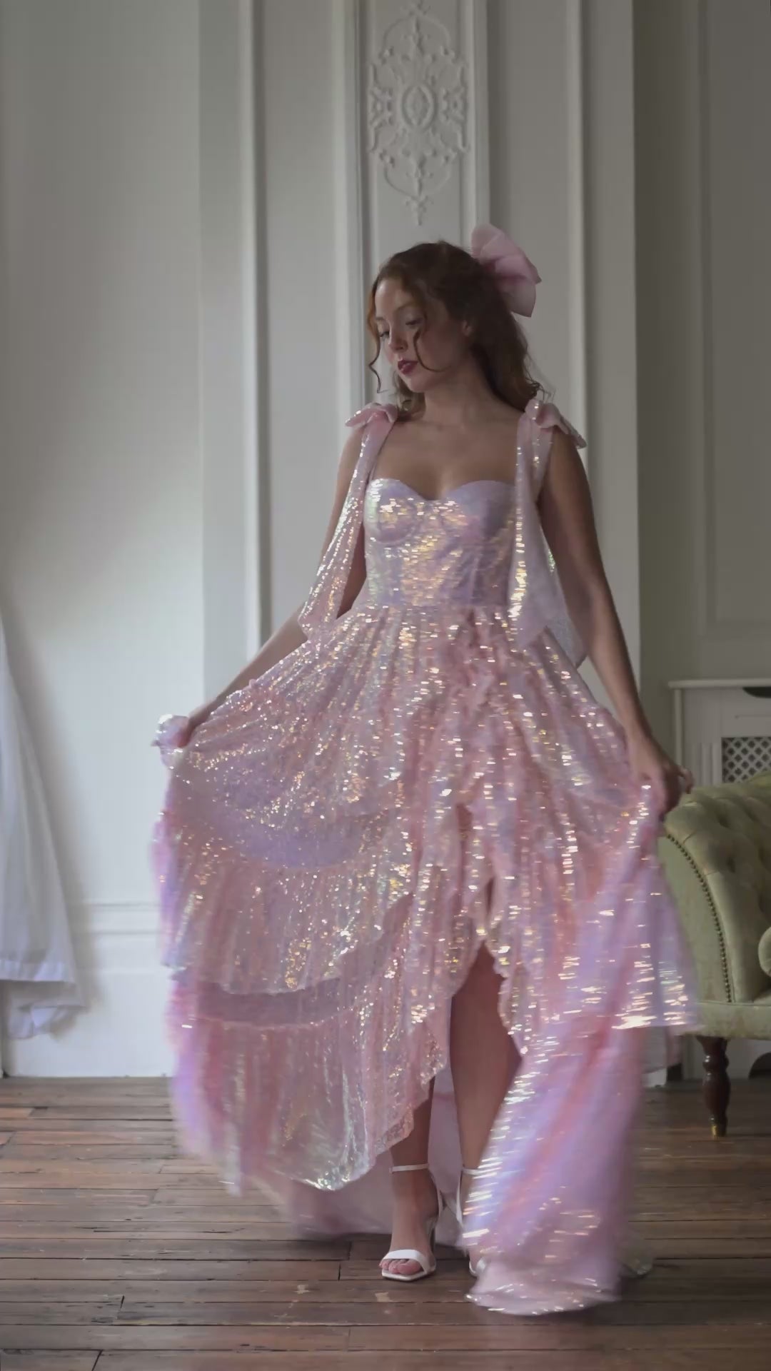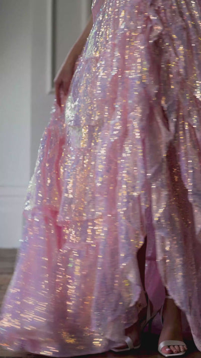 Unleash your inner goddess in Aphrodite's Kiss Lustre Gown. This exquisite sequinned masterpiece in a captivating pink hue will have all eyes on you.