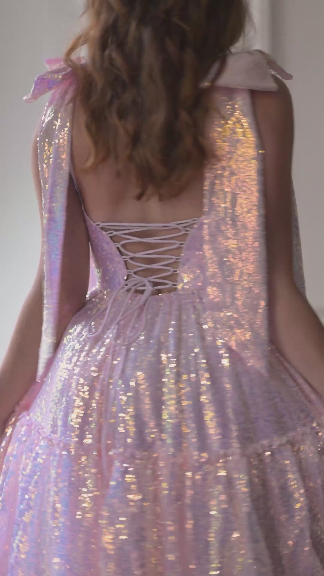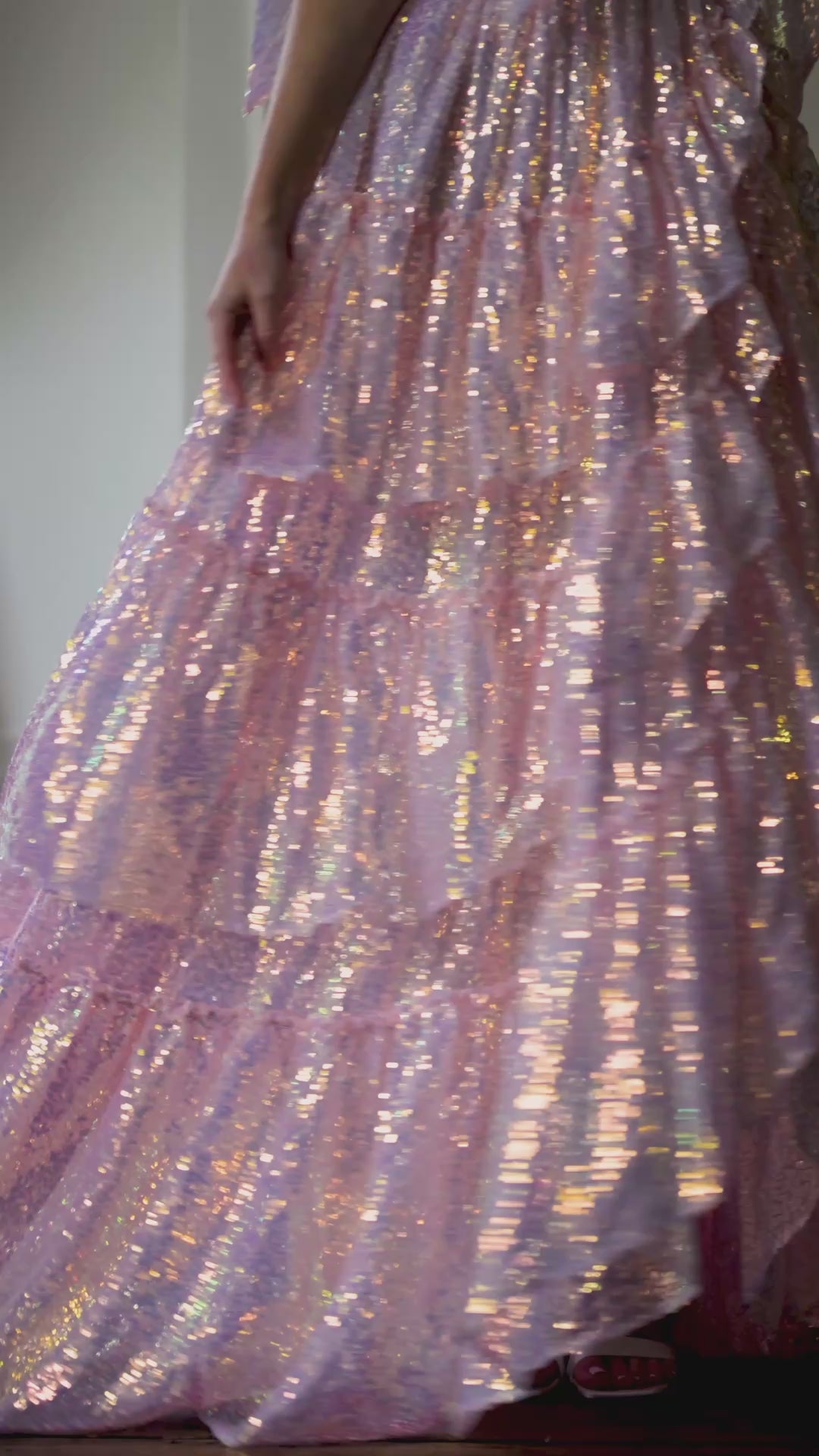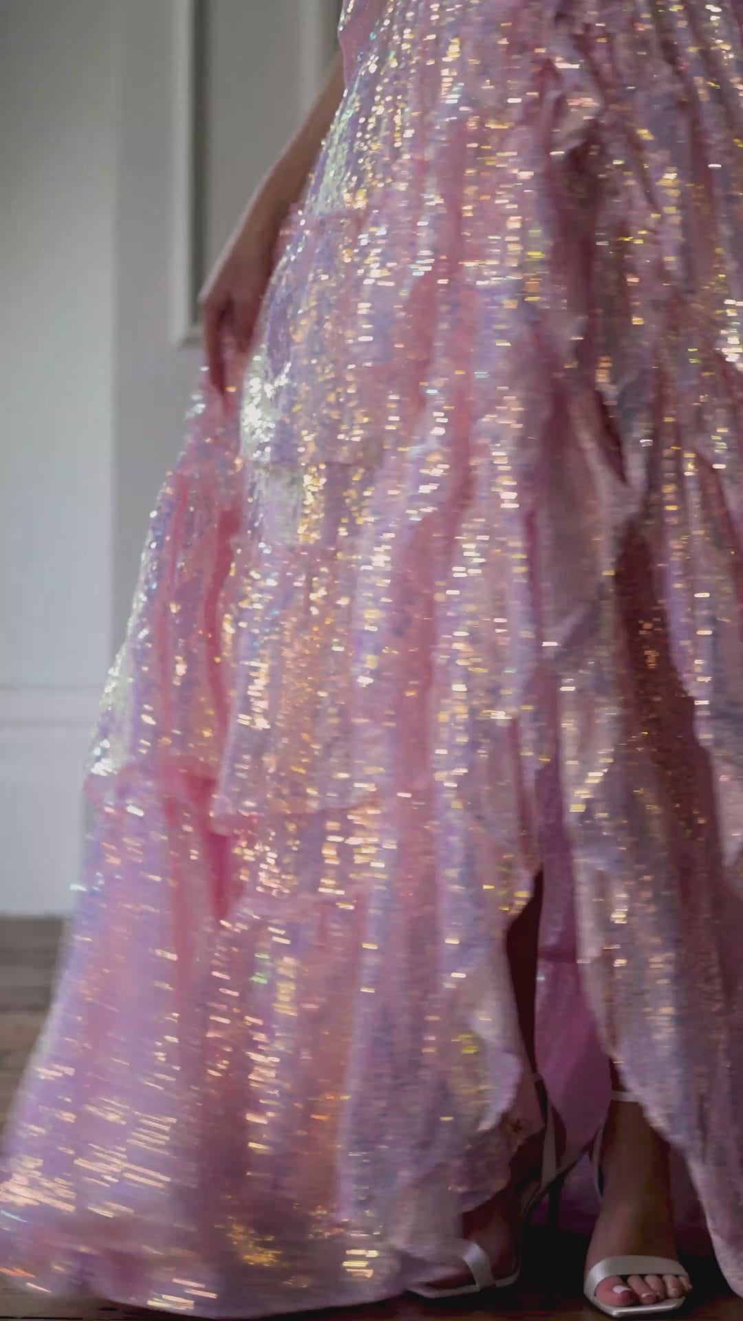 - Enchanting sequin fabric in Aphrodite's Kiss shade, which is a lustrous iridescent sequin sparkling in shade of icy pink through to amber
