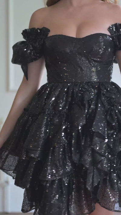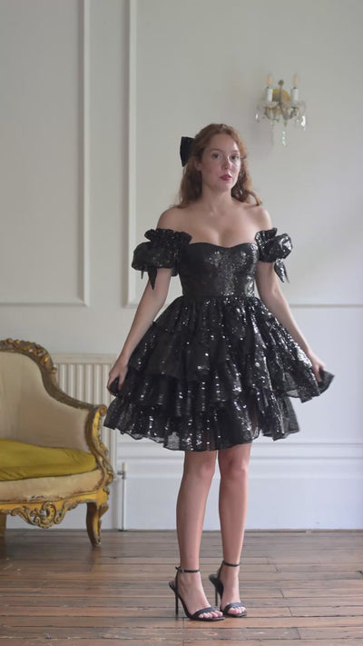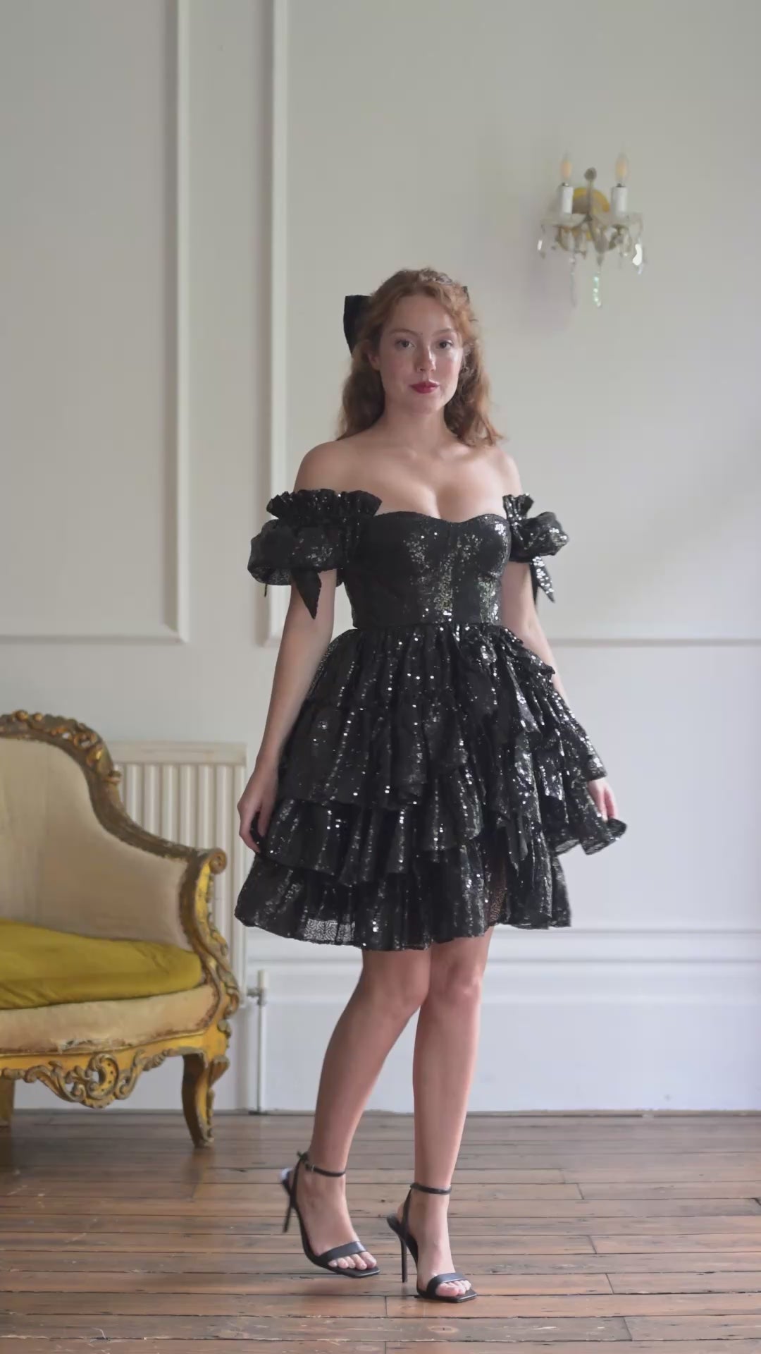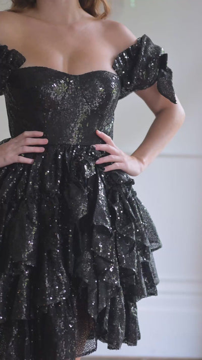 Dare to dazzle in the Black Pearl Damsel Dress. Shimmering sequins in a deep, rich ebony hue cascade down an exquisite ruffled skirt, while a captivating slit up the leg adds an alluring touch. The corseted bodice hugs your figure, creating a stunning hourglass silhouette that commands attention. Enchant the night when you slip into our Black Pearl Damsel Dress
