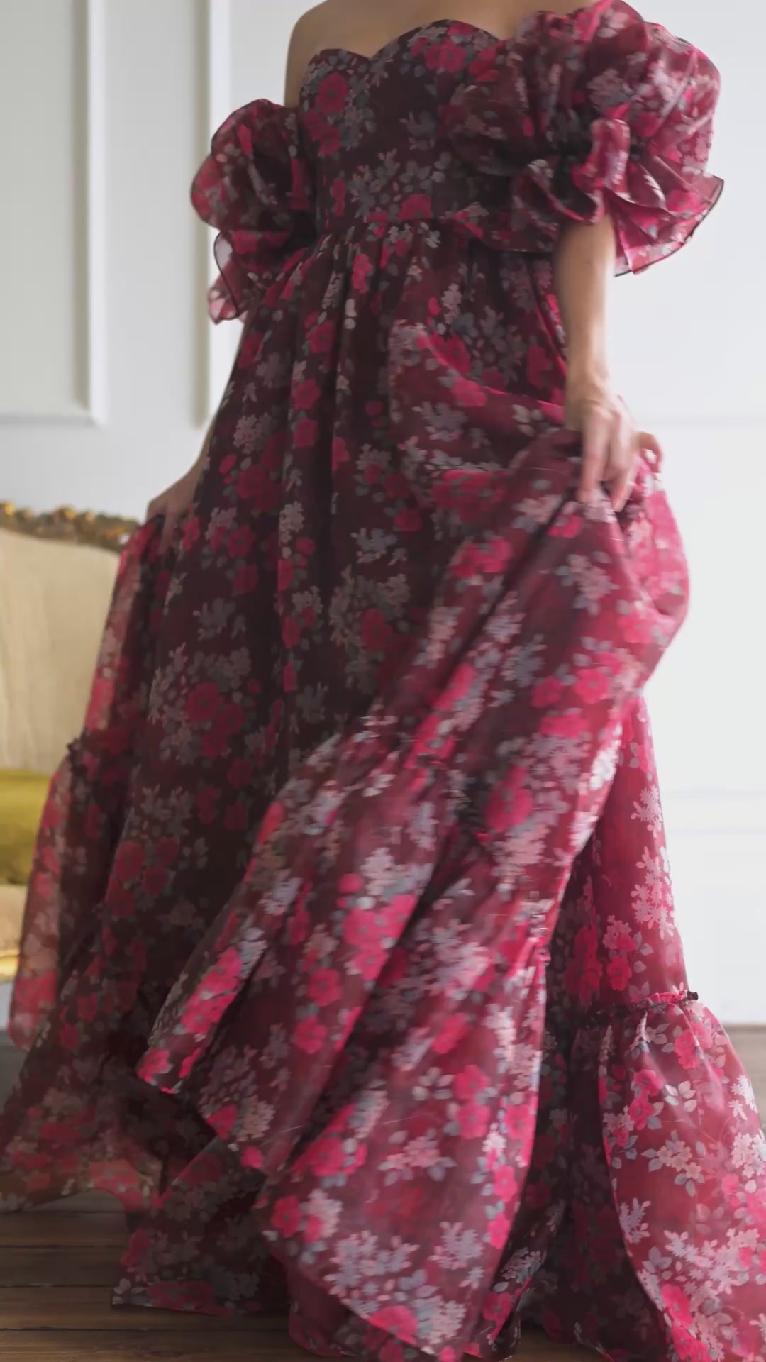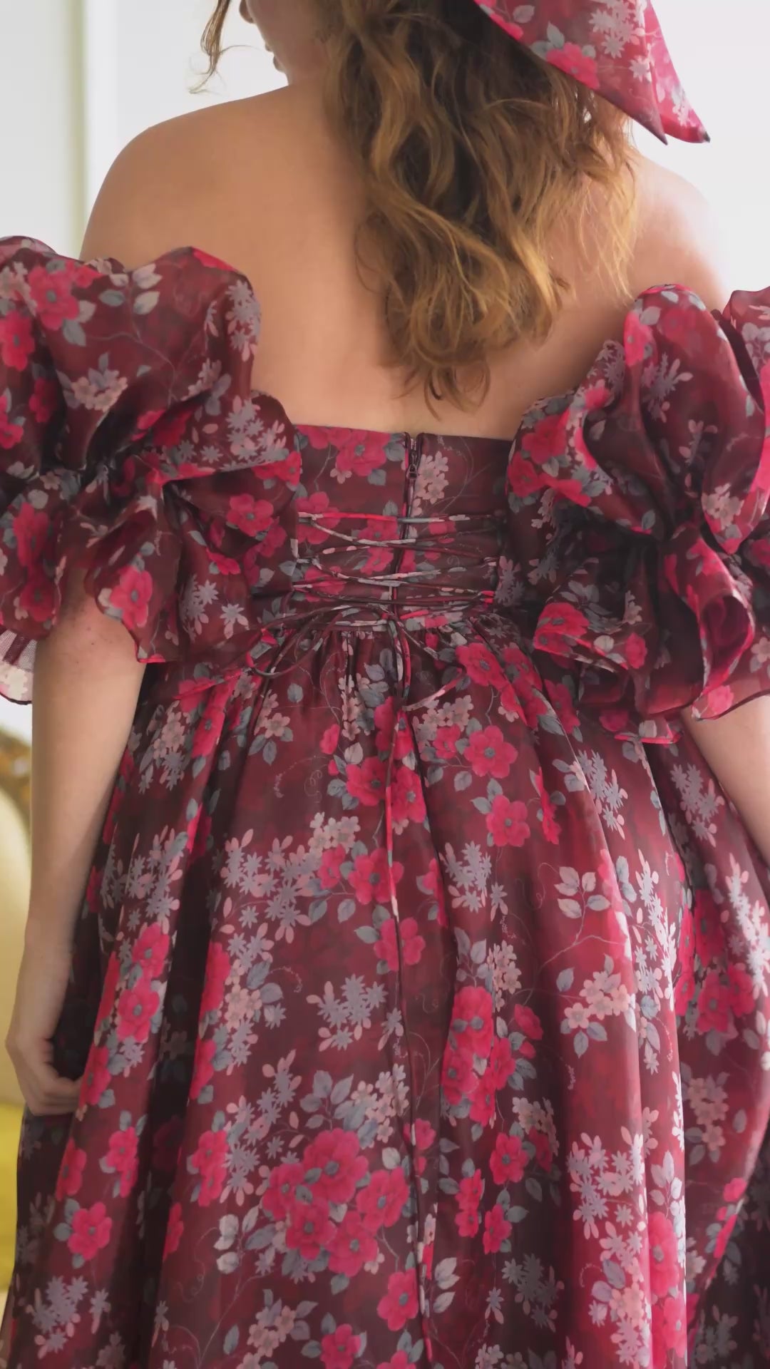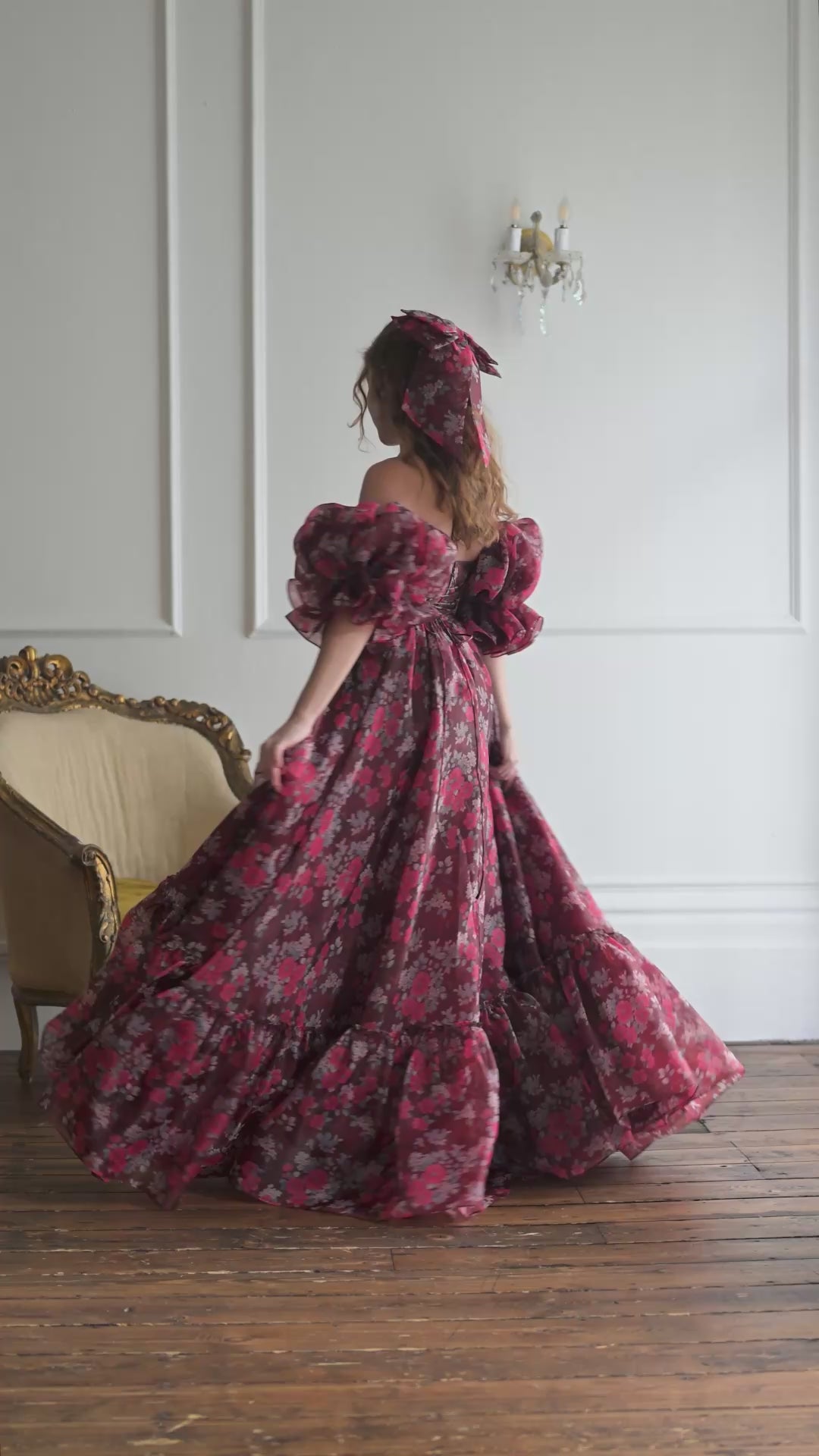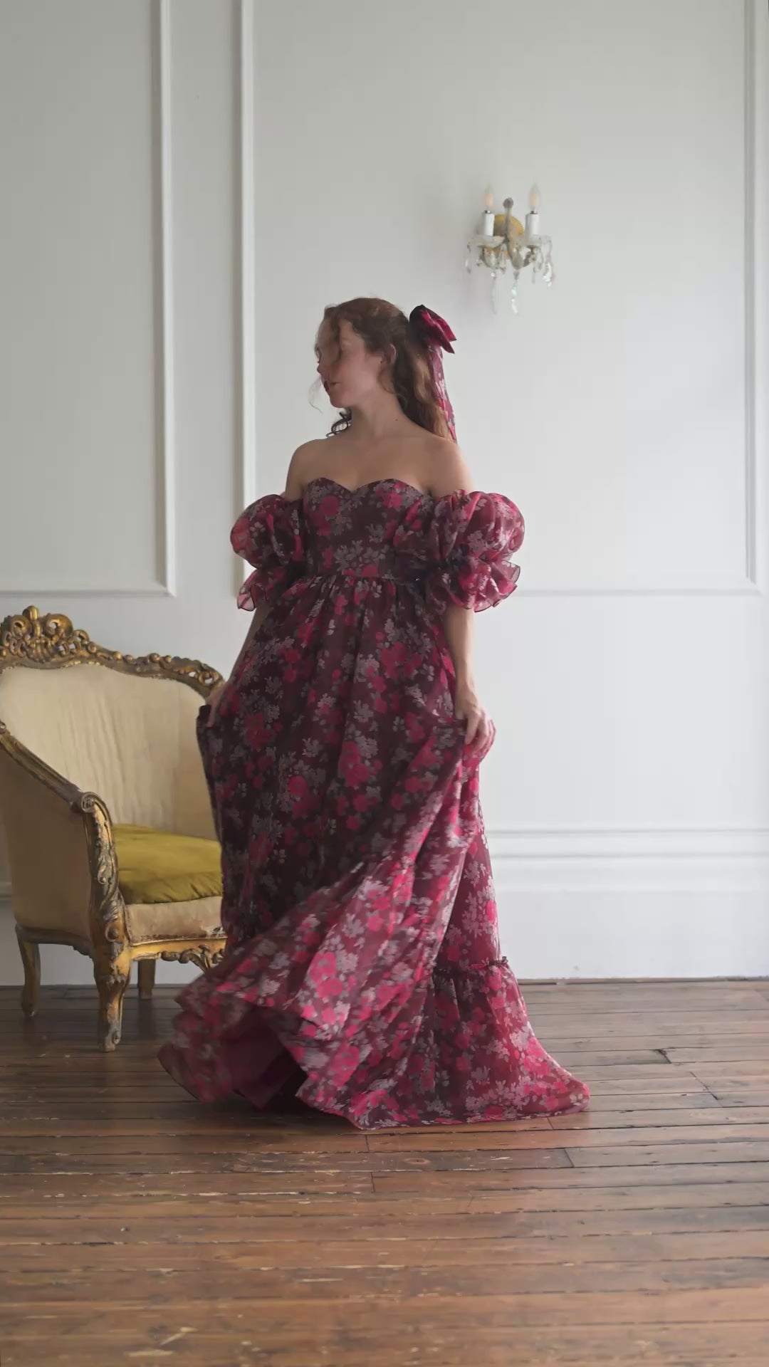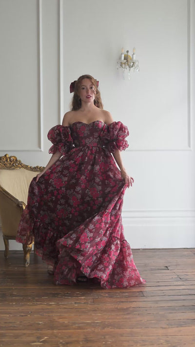 Embrace your dark fantasy in the breath-taking Briar Rose Belle Gown. With its rich burgundy hue and cascading coral blooms, this gown commands attention. The boned bodice provides a structured, flattering fit, while the beloved puff sleeves lined in fluffy tulle add an enchanting, feminine touch. Exuding an air of mystery and confidence, the Briar Rose Belle Gown is the ultimate femme fatale piece to elevate any special occasion.