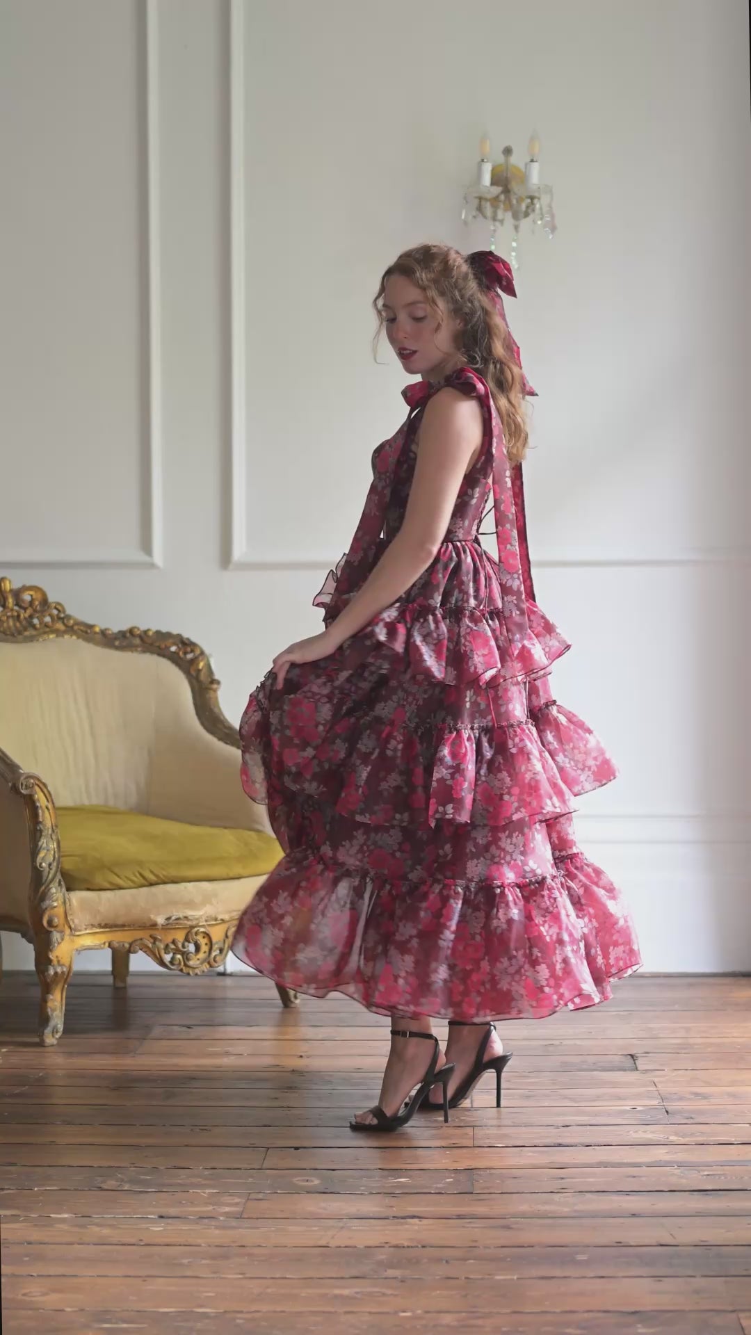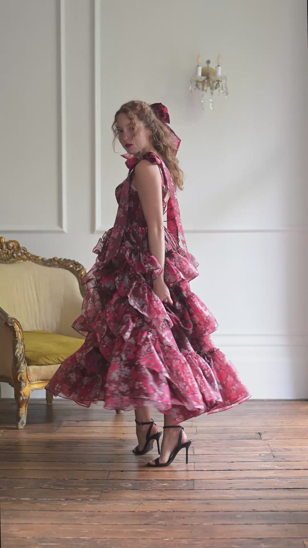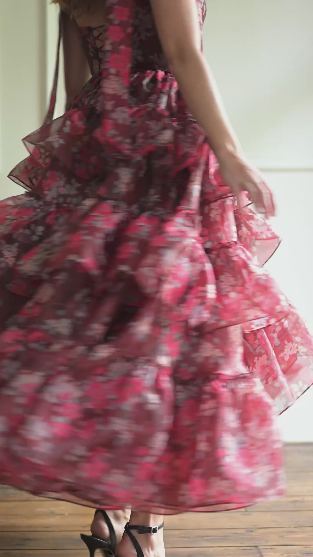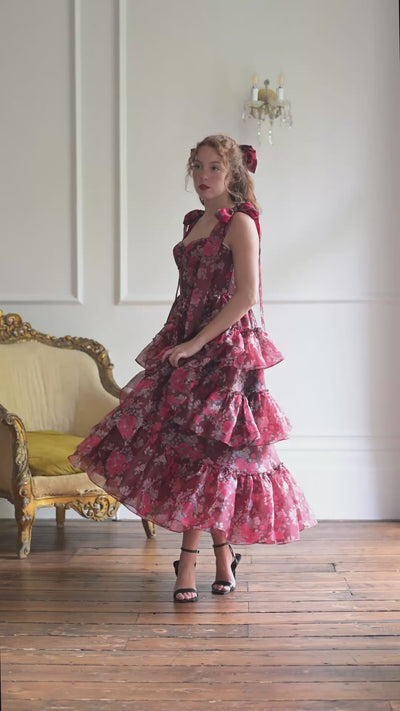 Unleash your inner femme fatale in the captivating Briar Rose Muse Dress. Adorned with a rich burgundy hue and alluring coral blooms, this seductive number flaunts a flirtatious ruffled skirt, a daring leg split, and a corseted bodice that commands attention.