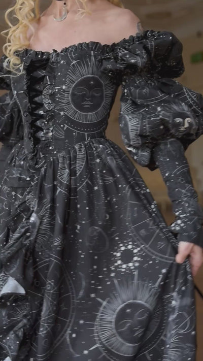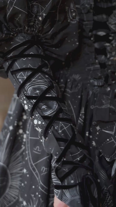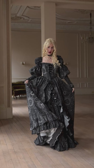 Surrender to the darkly romantic, bewitching allure of this achingly beautiful gown. The rich velvet and occult-inspired print summon the powerful essence of the goddess Hecate, the ruler of the night, magic, and crossroads. The corseted bodice and dipped waist create a captivating silhouette, which nods to historical 18th century gowns.
