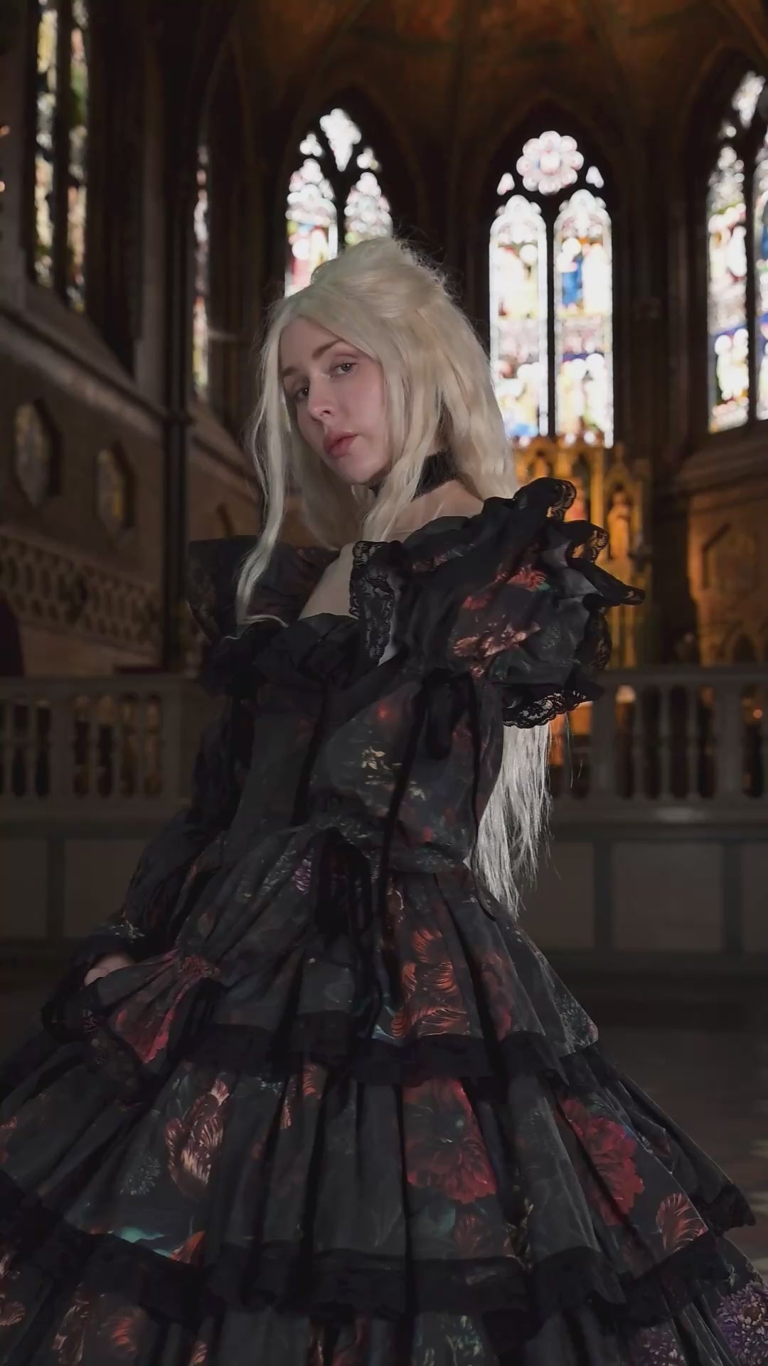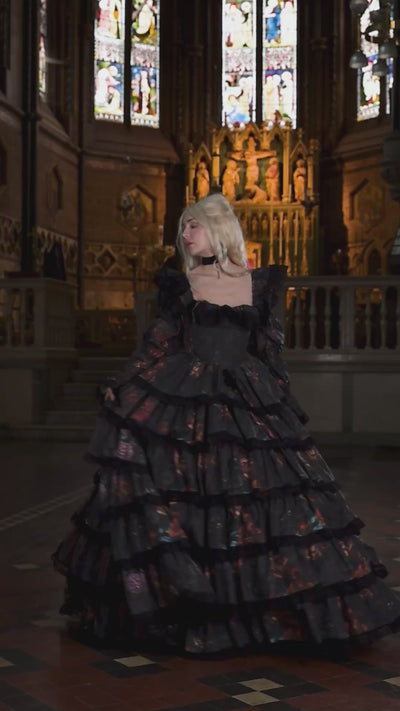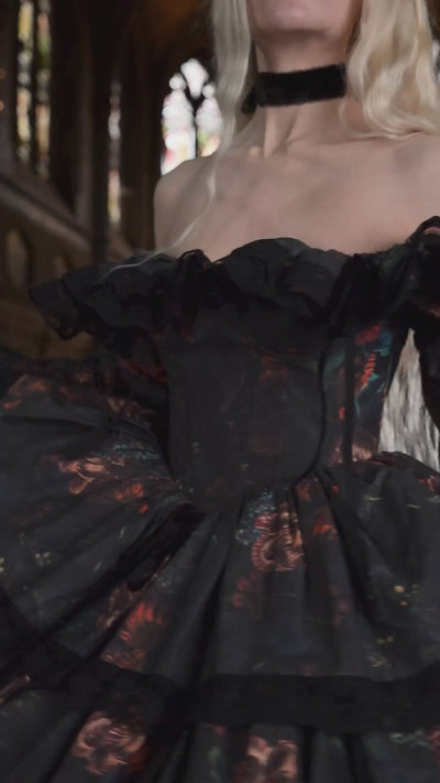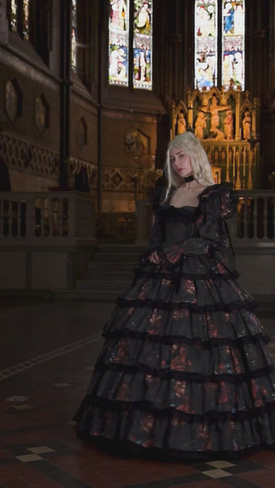 The Forbidden Fruit Age of Innocence Gown holds a quiet stillness—something suspended between girlhood and knowing, where softness is preserved, but no longer untouched. Its silhouette gathers and falls in gentle tiers, full without excess, creating a sense of presence that feels almost inward. There is a restraint to it, a composure that suggests not innocence alone, but something held carefully in place.
