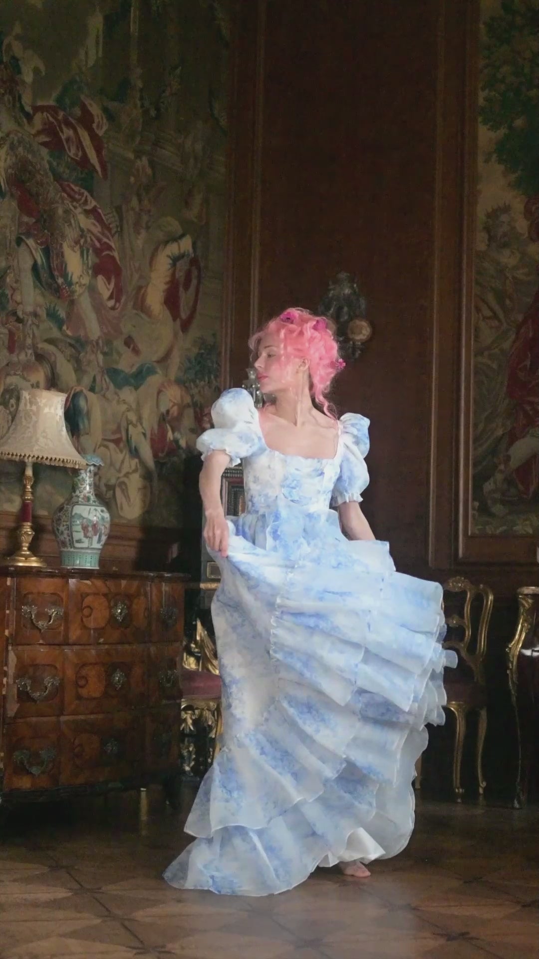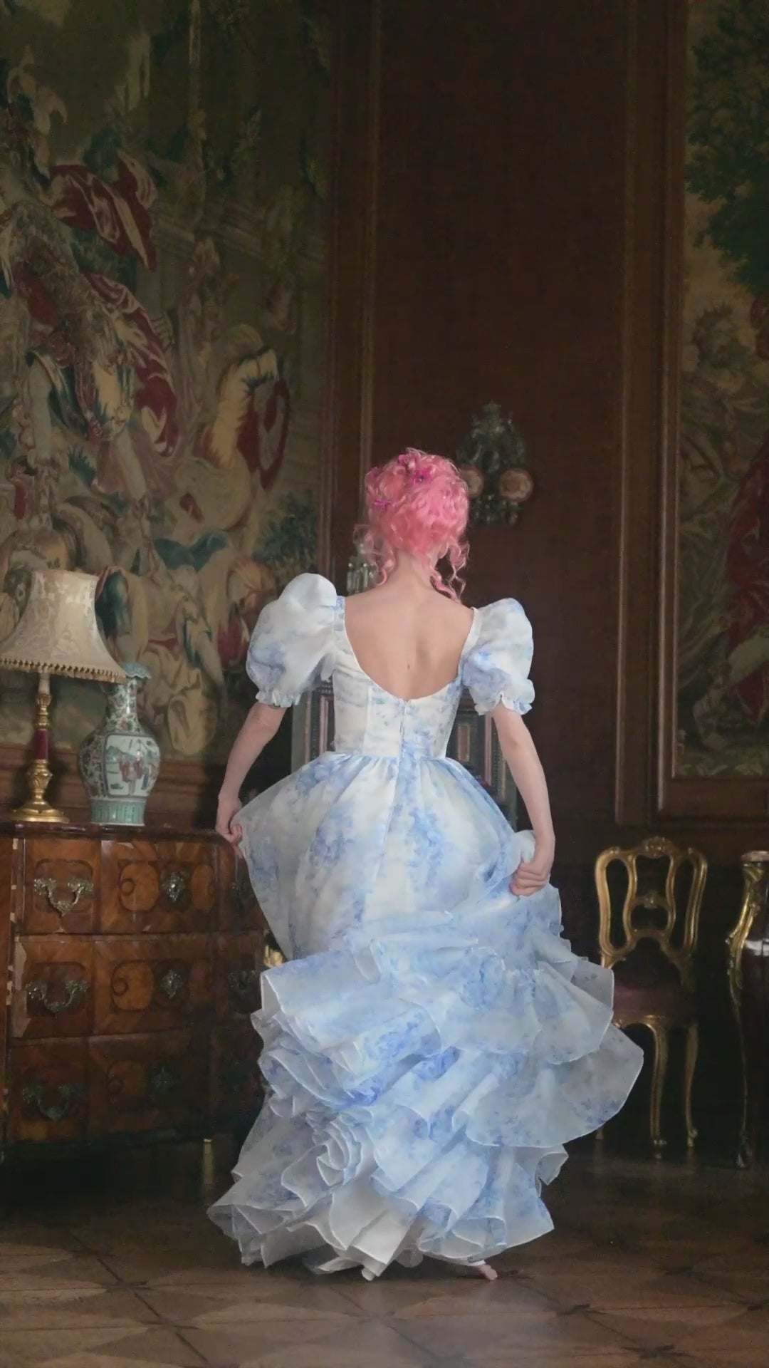 Step onto the continent this summer in the breathtaking French Porcelain Antoinette Gown! This ornate piece brings all the opulence of 18th century Versailles, with her angelic blue toile print, voluminous ruffled organza skirt, and exquisite corseted bodice. The dramatic organza skirt is gathered at the waist into an oversized bow, then flows gracefully into delicate ruffles that billow dreamily around you as you walk. The bodice features a flattering Queen Anne neckline which frames and flatters the decolletage, whilst the neckline line flows dreamily into a low scooped back reminiscent of the costumes worn by ballerinas in the French Ballet.