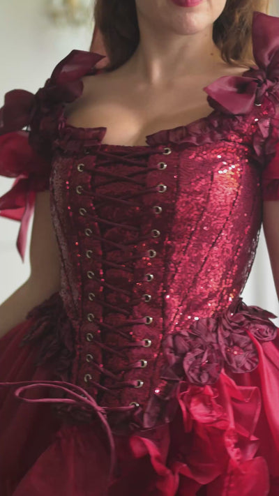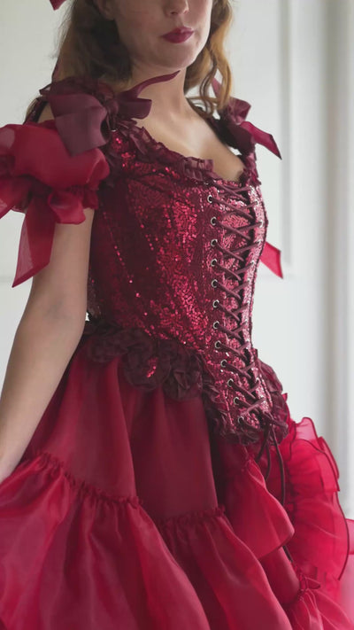 Unleash your inner Parisian siren with the Rouge Étoile Pompadour Corset. Shimmering crimson sequins and delicate organza trims evoke the decadence of 18th century France, while the Pompadour design sculpts your curves into a hyper-feminine silhouette that's guaranteed to turn heads.