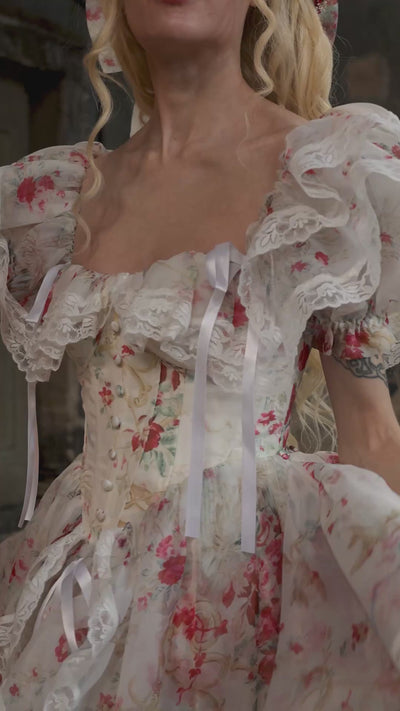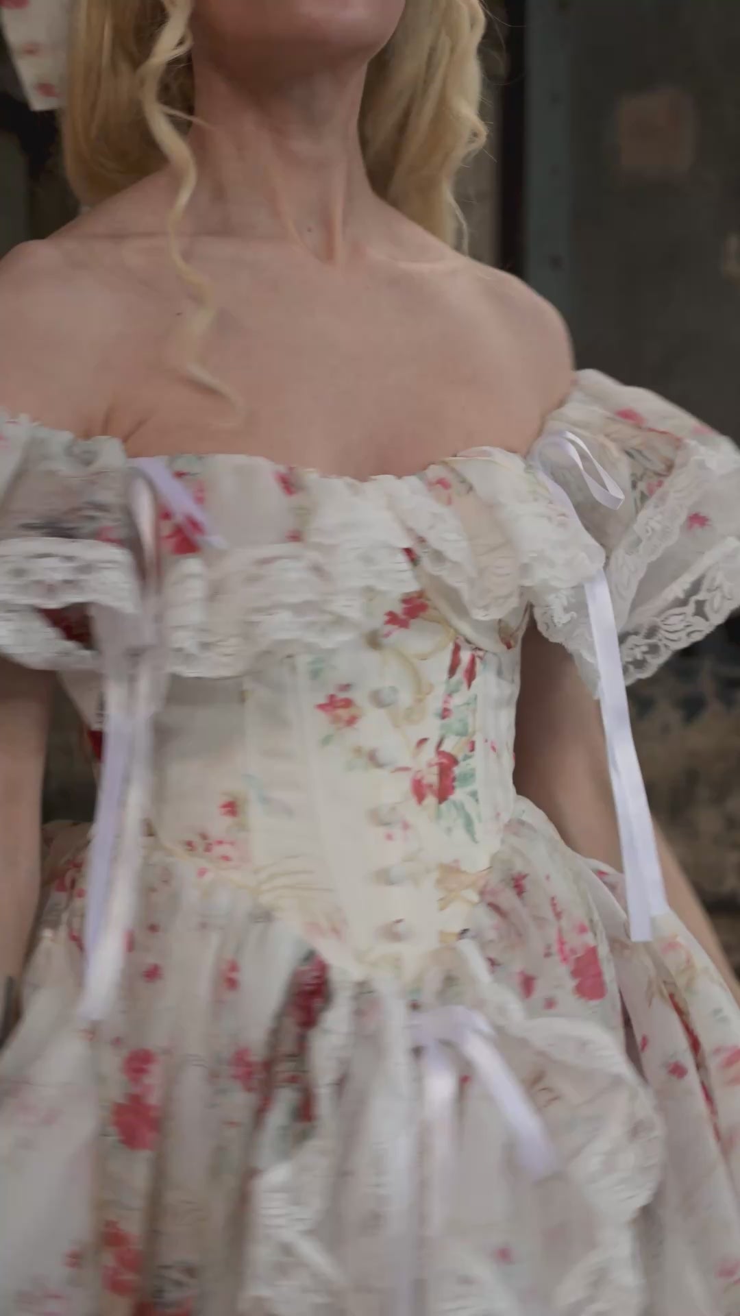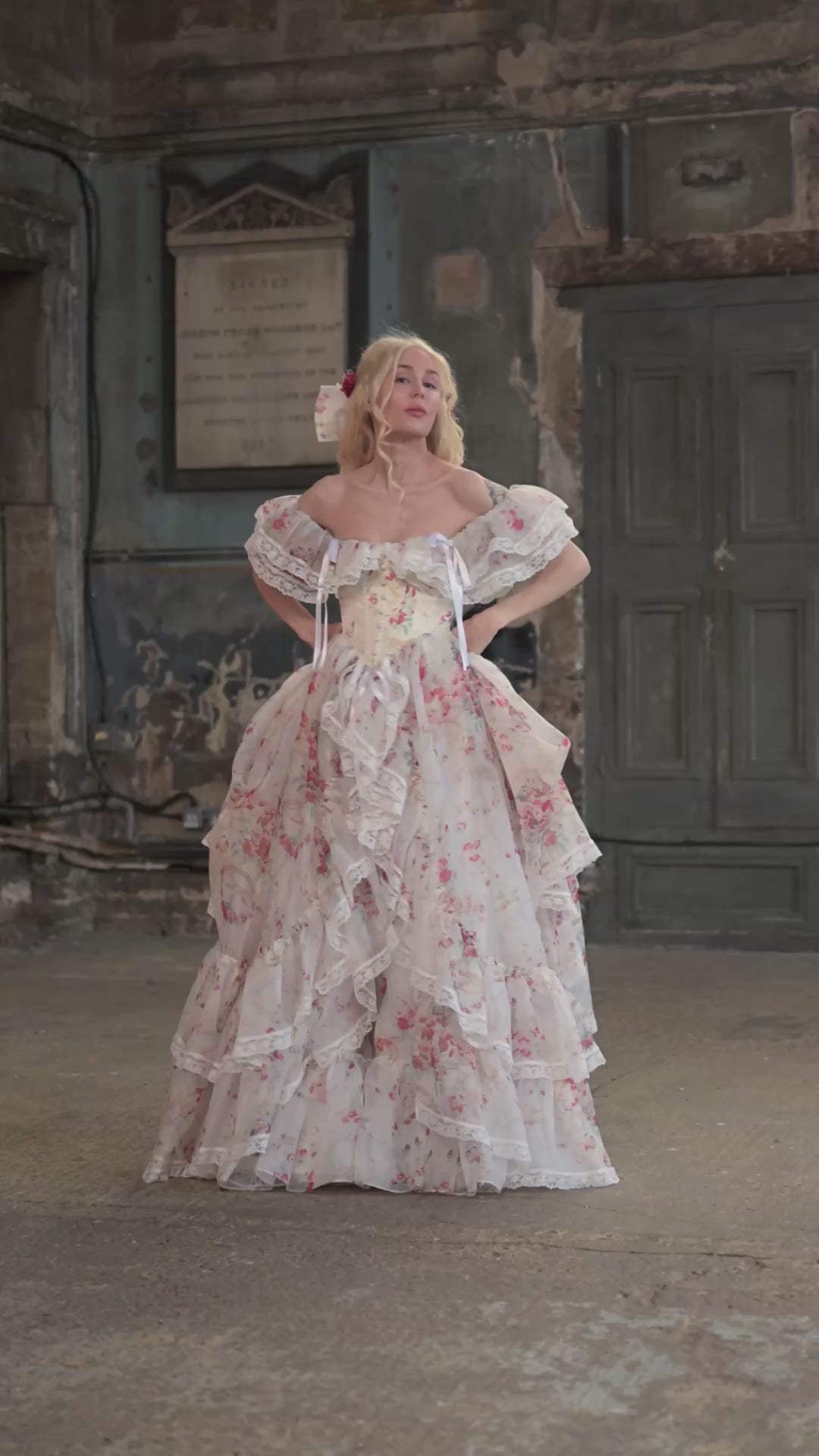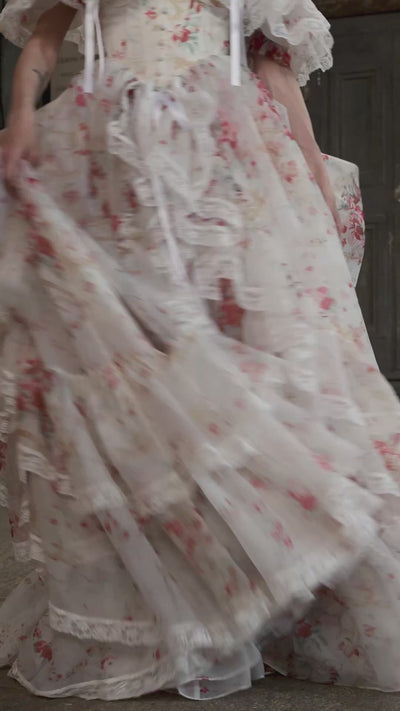 - Multi-layered organza skirt with curtain front design, styled after Marie Antoinette's famous gowns