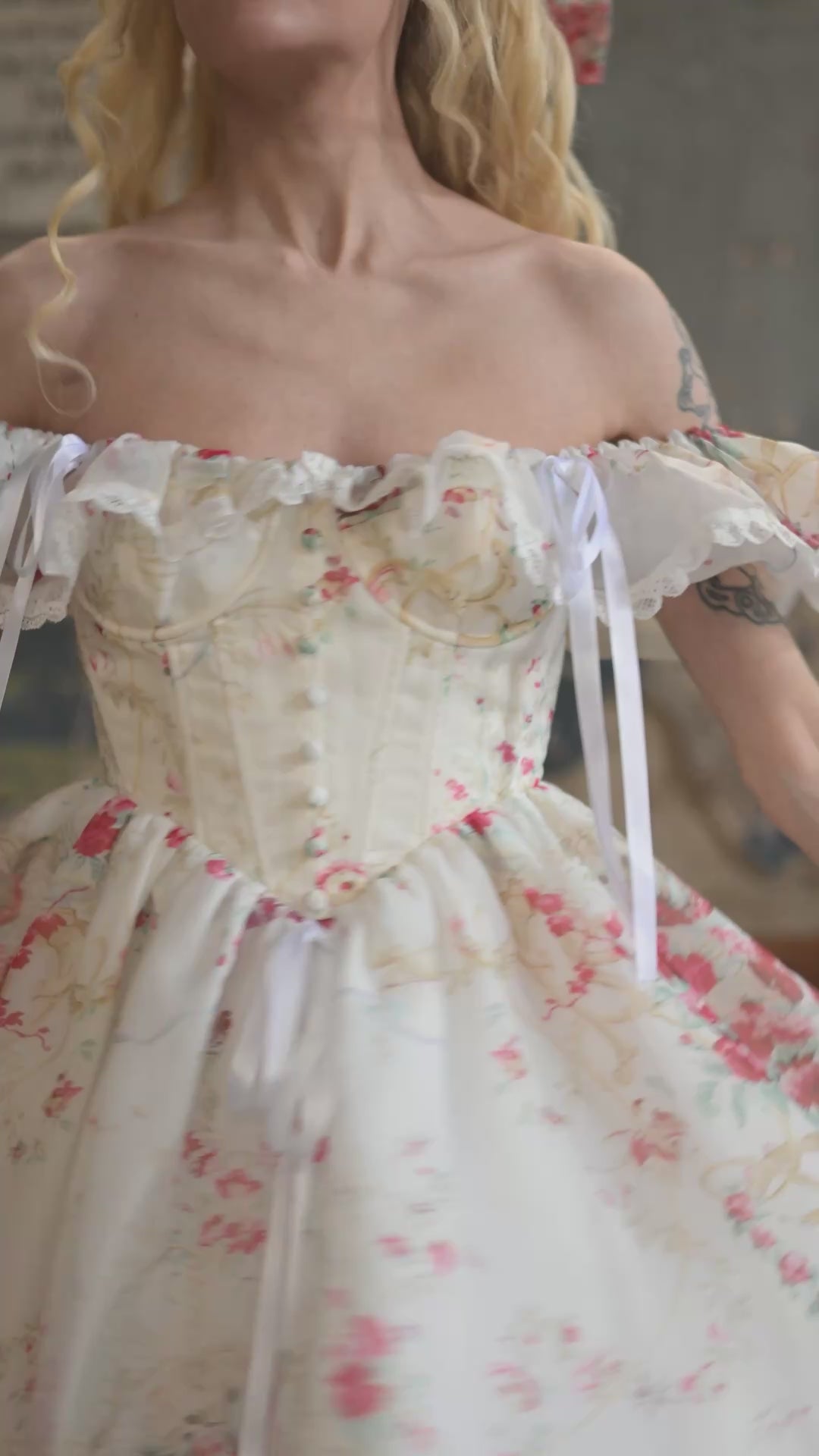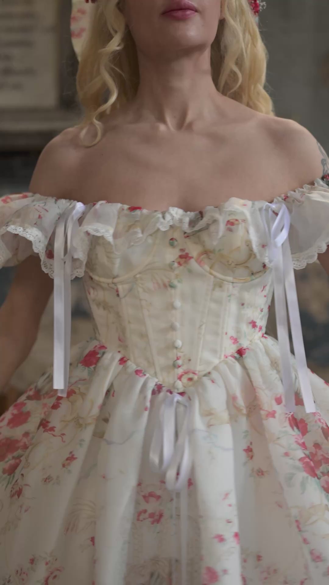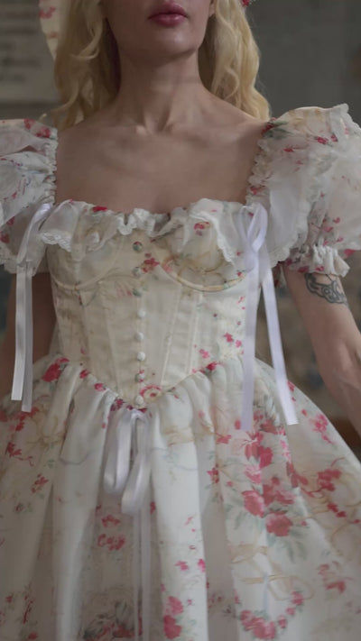 - Corseted bodice with dainty button detailing