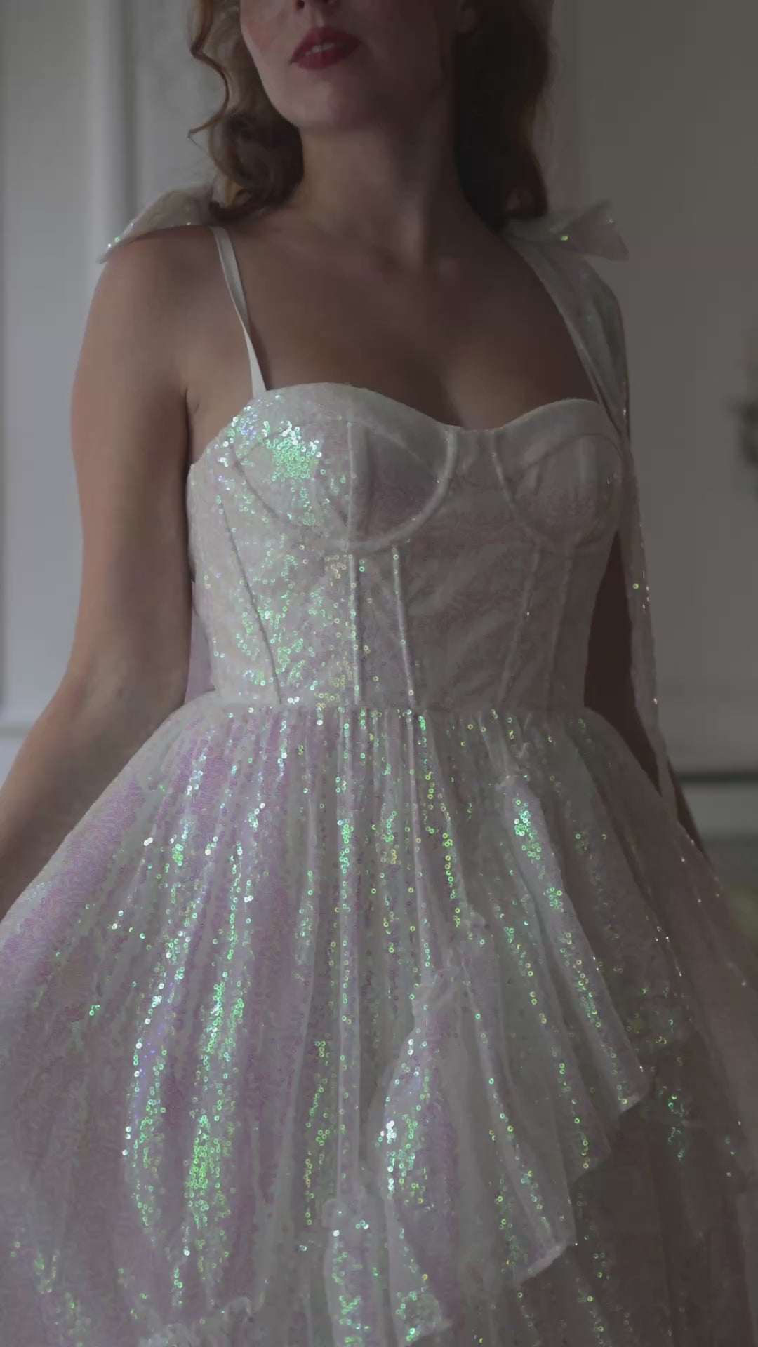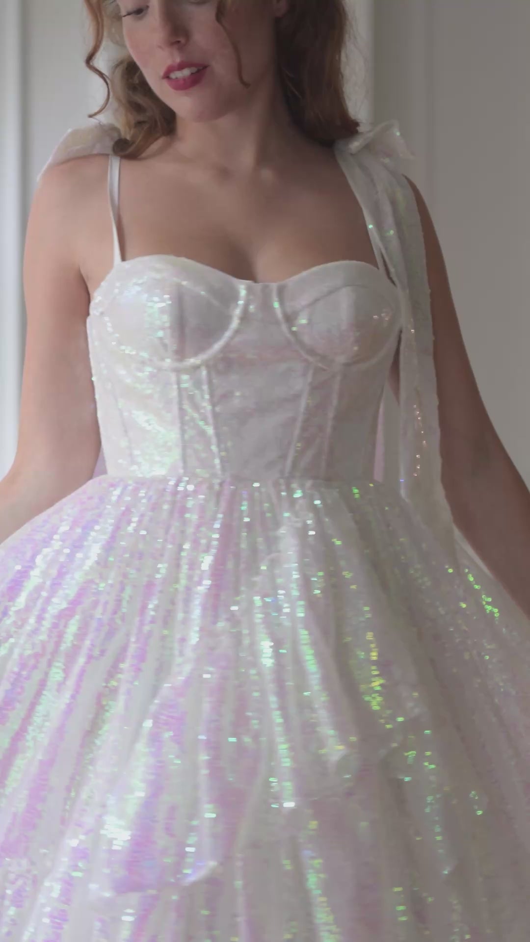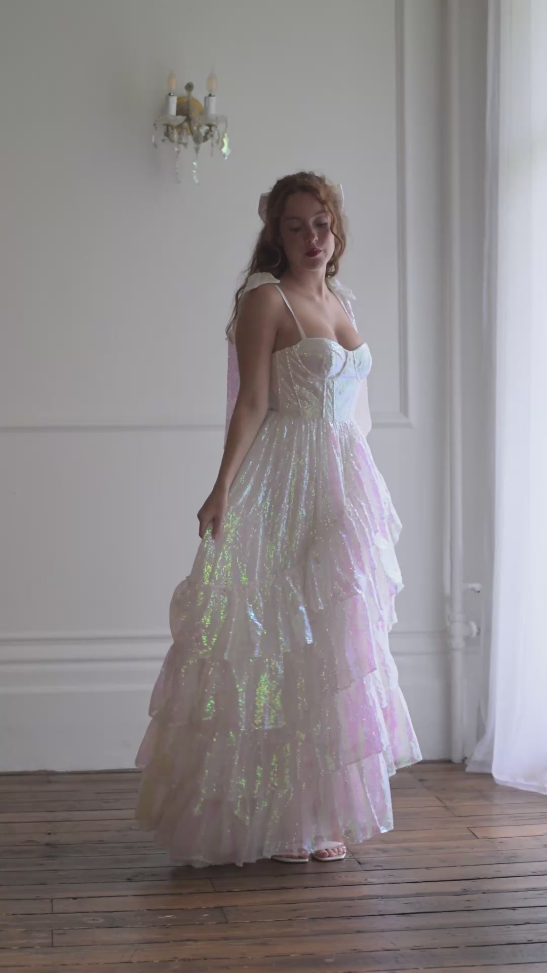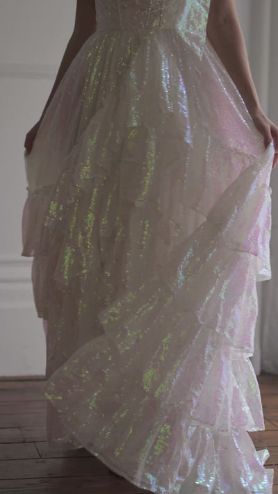 Ethereal beauty descends from the heavens in the form of the Unicorn Tears Astrielle Gown. This premium couture masterpiece is adorned with sparkling white sequins that shimmer and dance with an iridescent glow, creating an otherworldly, angelic allure.