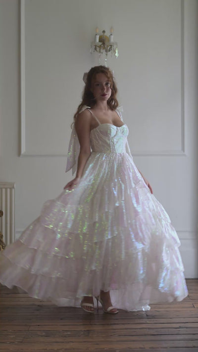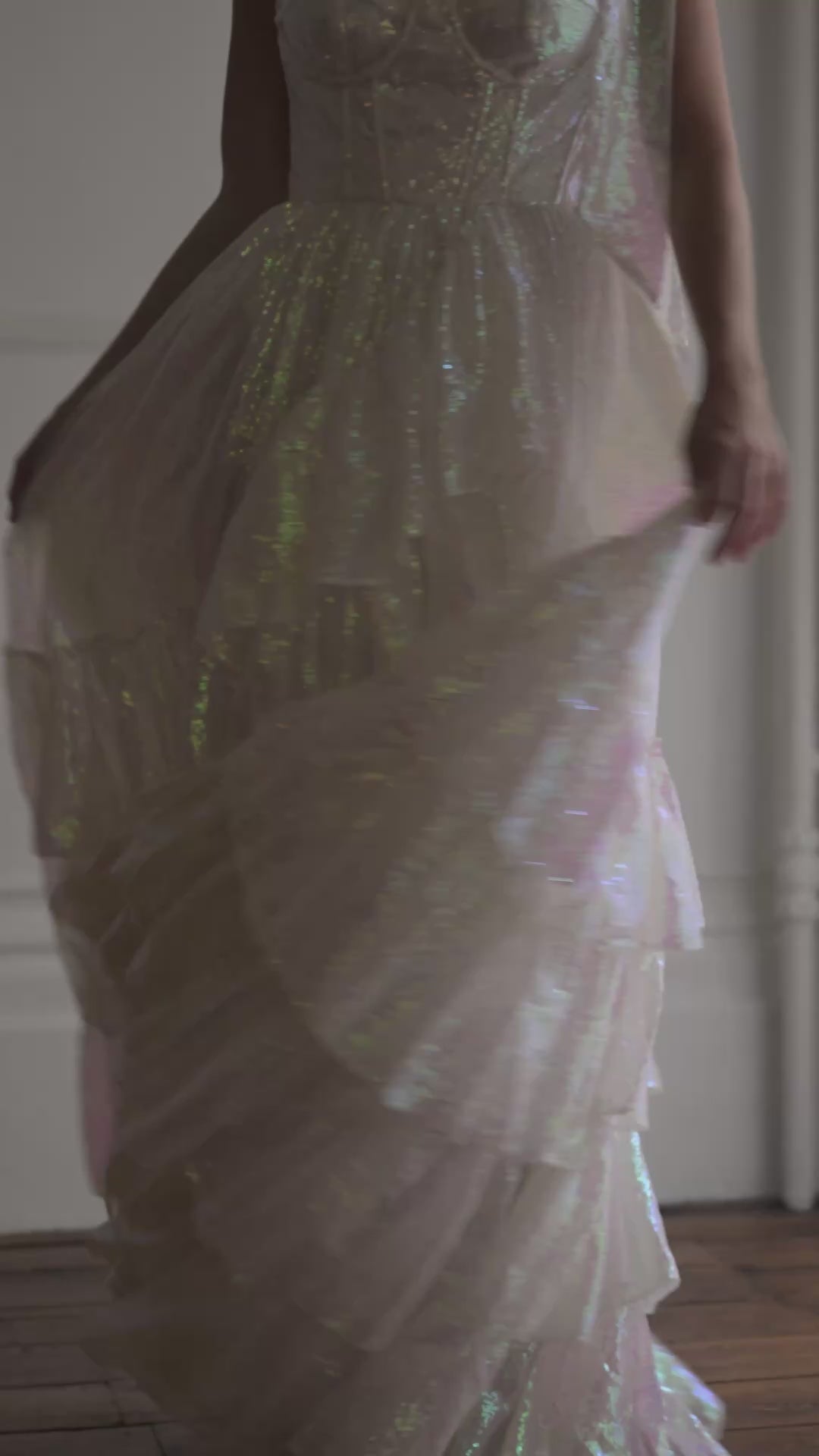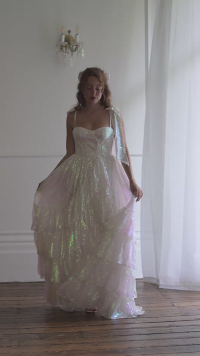 Whatever your bridal style, the Unicorn Tears Astrielle Gown will make you feel like a goddess among mortals. Prepare to be the centre of attention as you float across the room in this stunning, iridescent masterpiece.