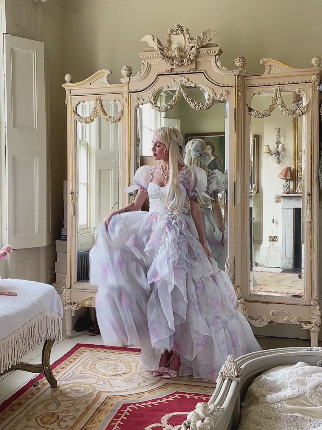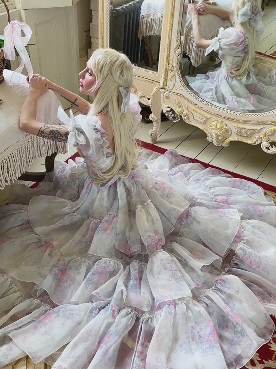 Our most extravagant gown yet! A historical silhouette featuring cascading tiers of ruffles, modernized by a slit up the leg and decorated with pastel flowers and bows. She's a gown designed to by worn by modern day Marie Antoinette, as she nibbles pastel macarons, adds an extra feather into her bouffant, and generally has the time of her life!