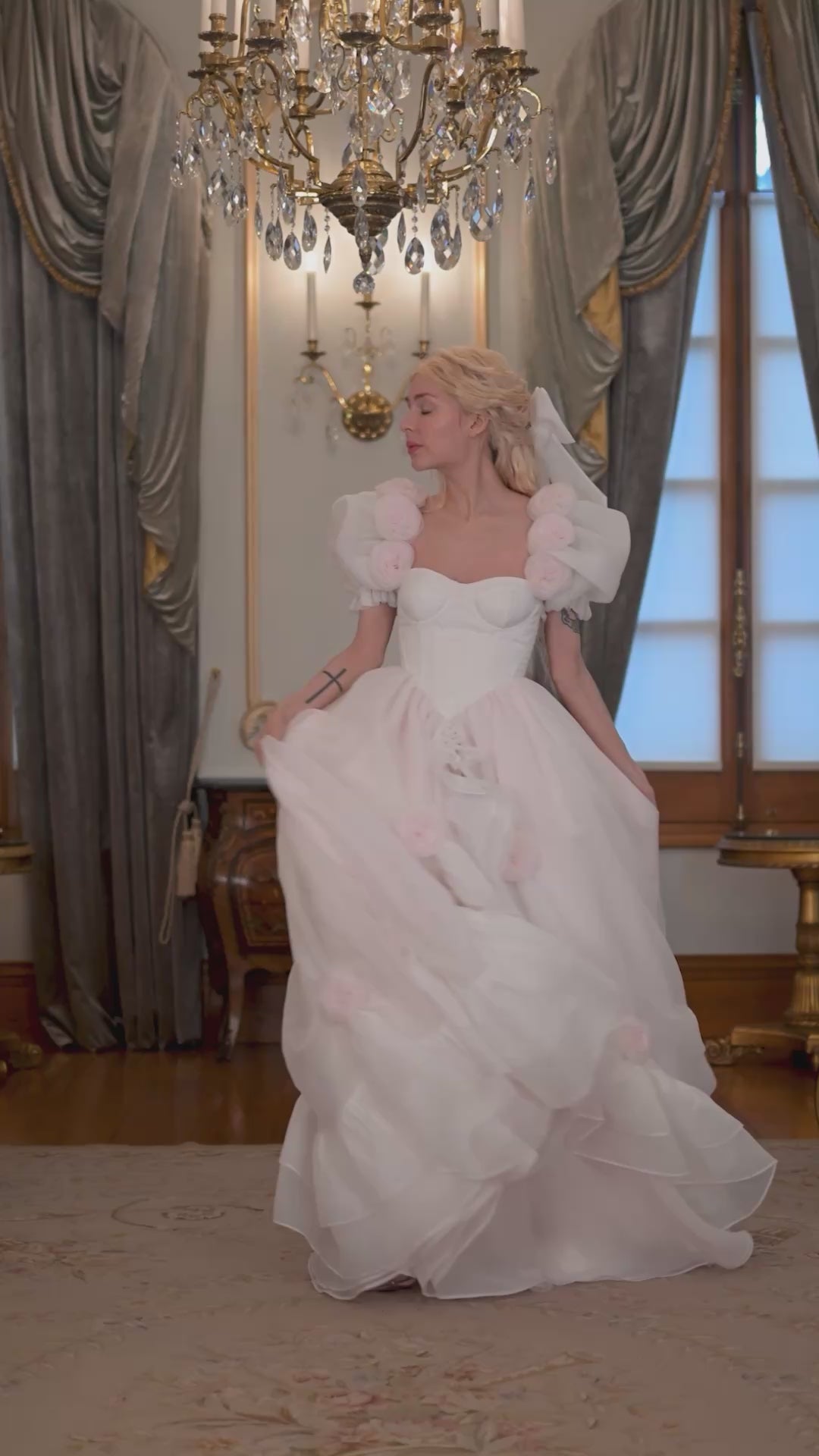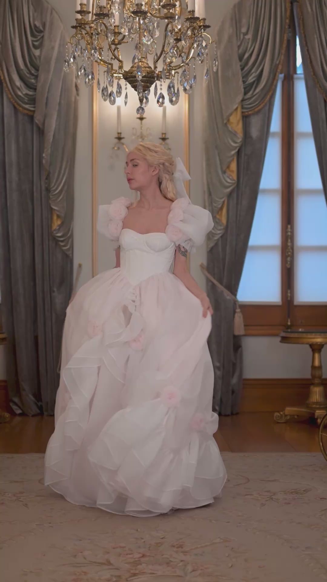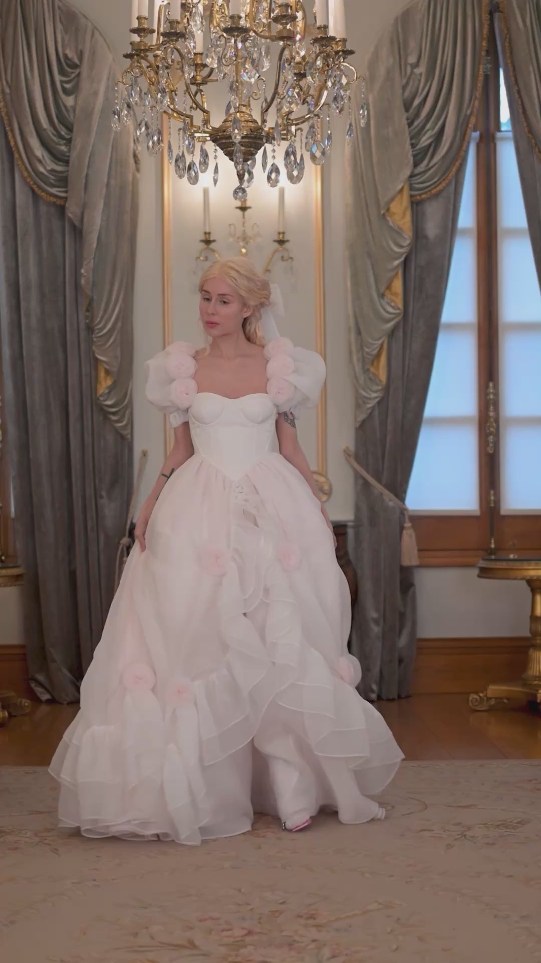 - Exquisite couture gown adorned with rosebuds and ruffles