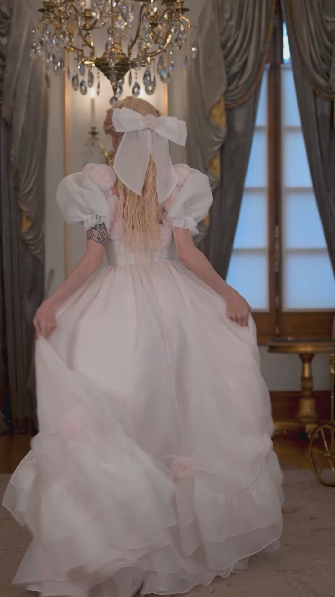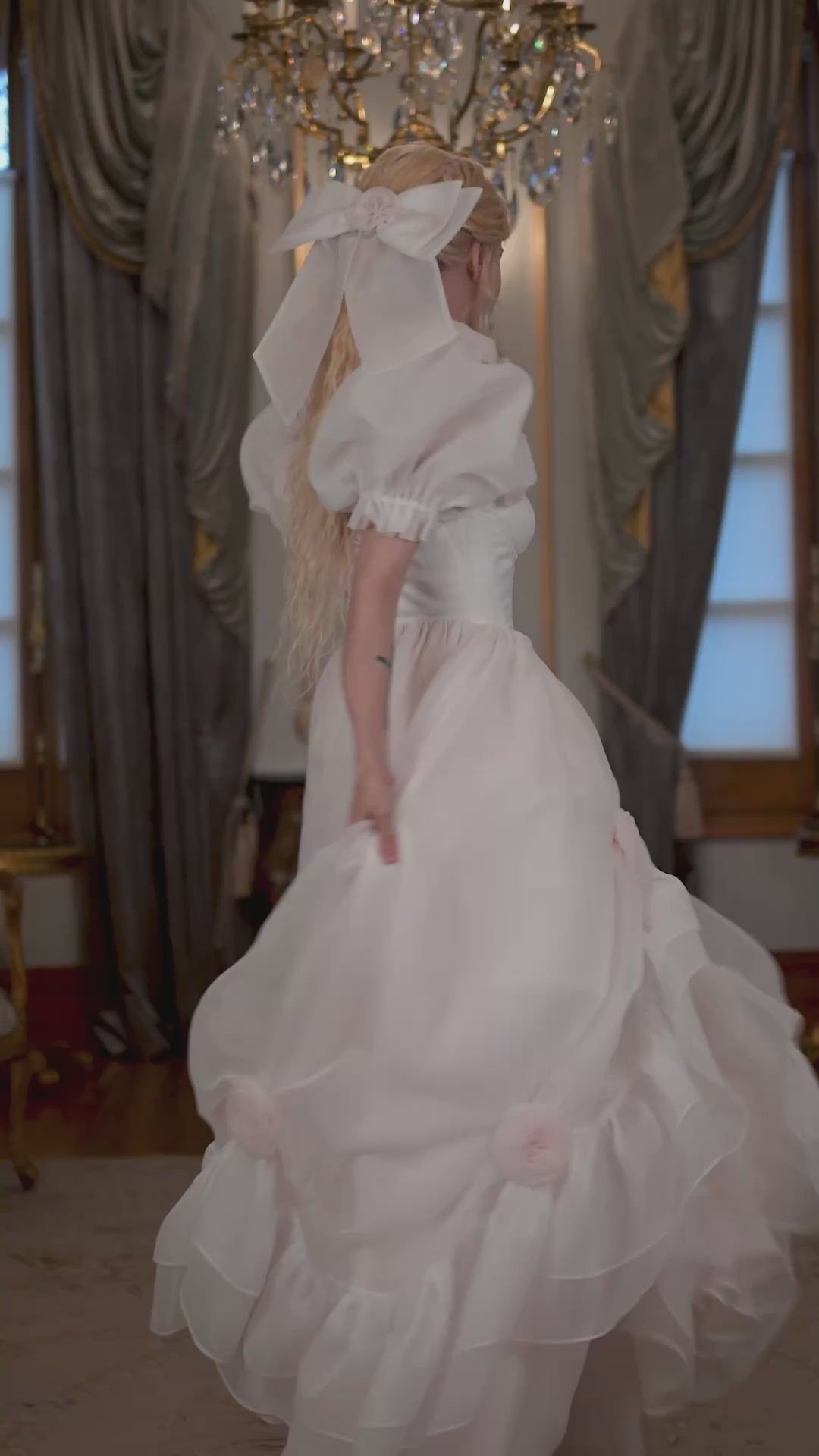 - Combines innocent ivory and blushing rose organzas
