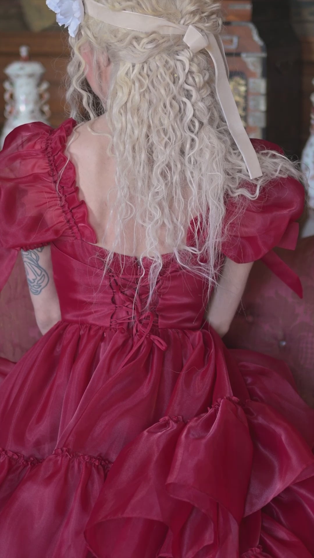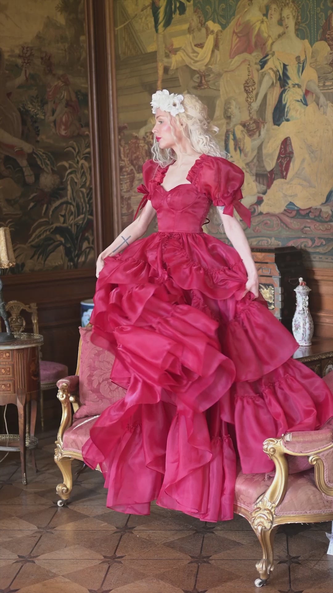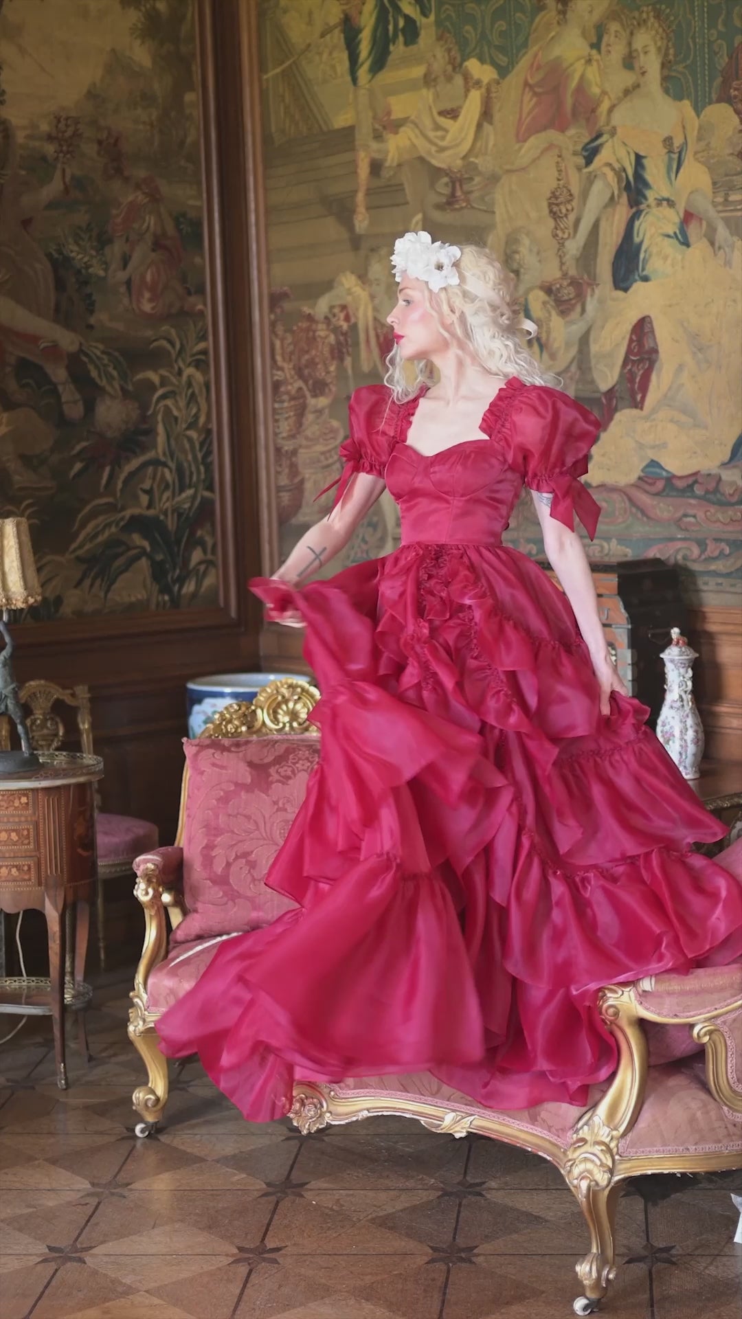 Make a dramatic entrance in the Maison Rouge Mademoiselle Gown. This show stopping dress evokes the romance and opulence of 16th century high society with its rich ruby color and voluminous ruffled skirt.