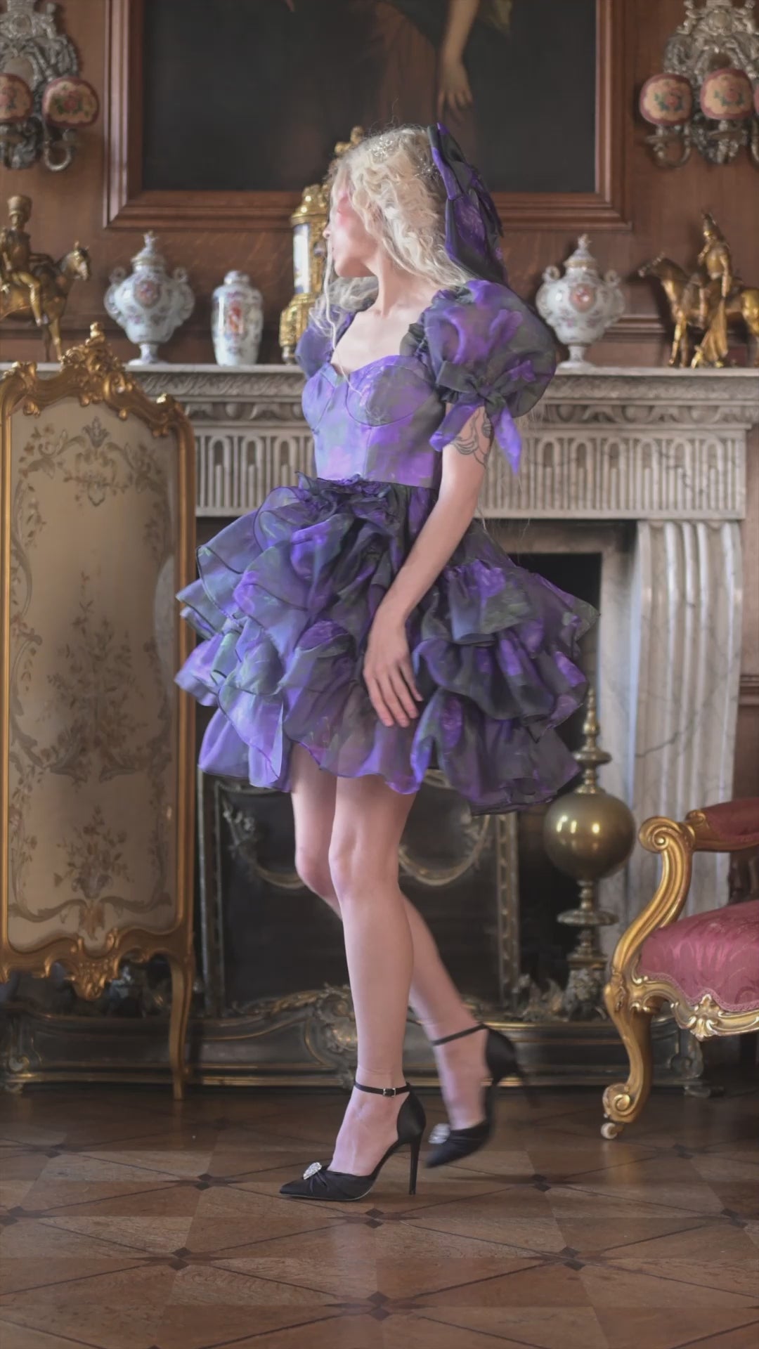 Step into the soft glow of the moonlight and transform into the darkly romantic muse of your dreams. The sweet ruffles bloom across the skirt, adding an extra layer of intrigue, whilst setting off the print to dramatic effect. Watch as the moon illuminates the violet hued roses as they sweep across a deep navy backdrop reminiscent of the night sky.