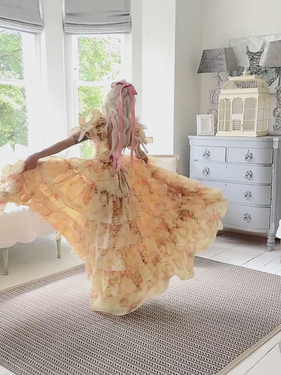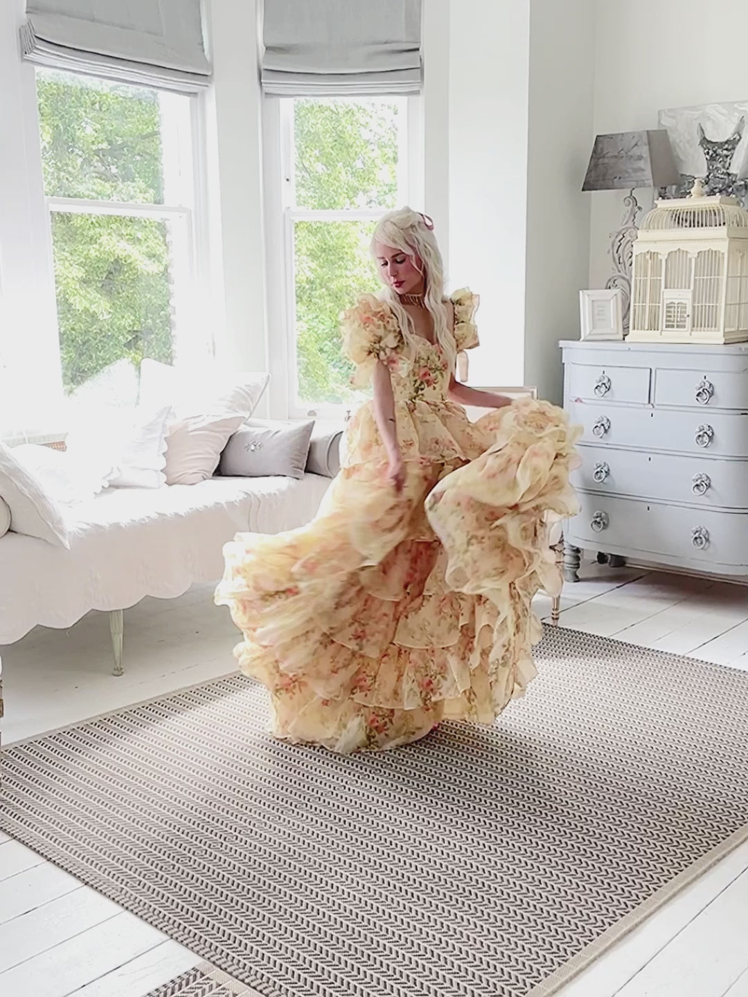 Let's indulge in a little make belief... step back in time to the turn of the century, and re-imagine yourself as a fresh-faced Southern Belle, like Scarlet, preparing to make your debut into high society. We've drawn from this tradition, creating a gown dripping with soft ruffles that cascade in tiers from your waist, surrounding you with a sea of exquisite watercolour roses. Featuring a sweetheart neckline bodice, ruffle and bow adornments to the sleeve, and a corseted waist to snatch the figure, our Debutante Gown is fit for royalty.