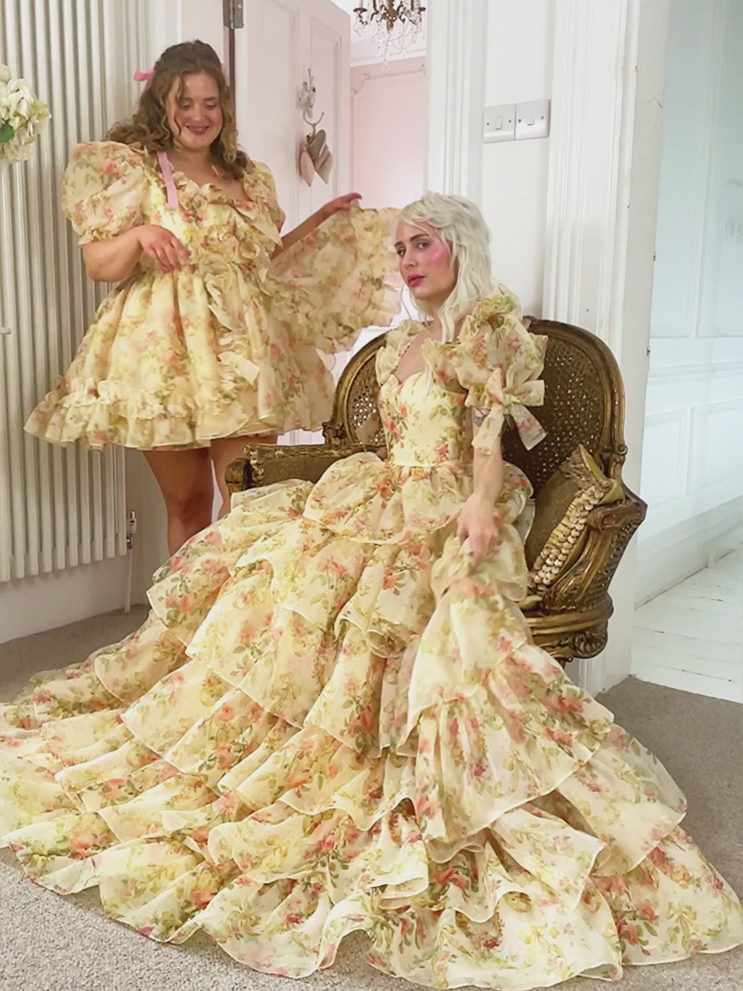 Printed exclusively with our Queen Alexandra print; an extravagant celebration of Rococo florals and damask. The Debutante comes in the softest shades of buttermilk and coral, which are hand painted into the most exquisite watercolour floral which simply cannot be replicated. You will feel as though you are wearing the splendour and pomp of Versailles, all in one magnificently crafted gown.