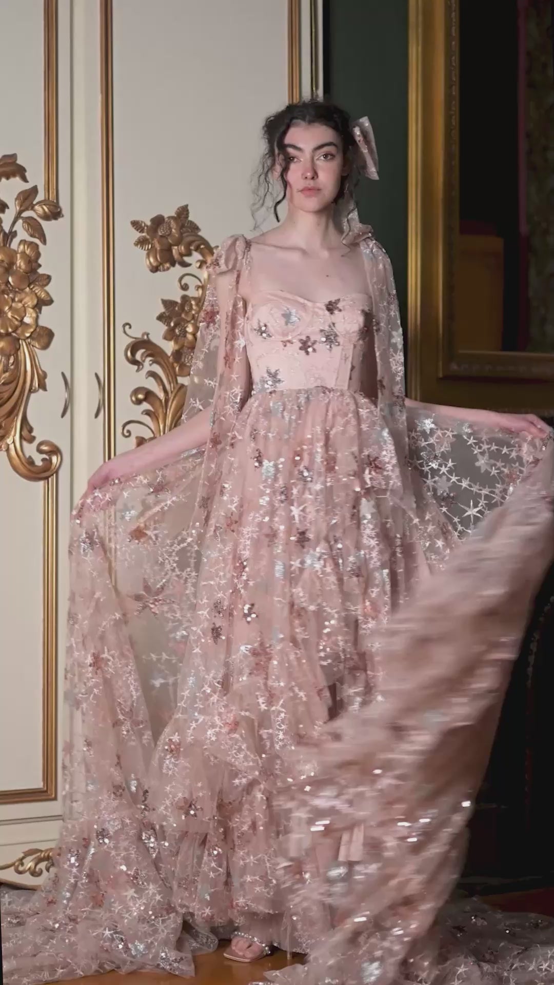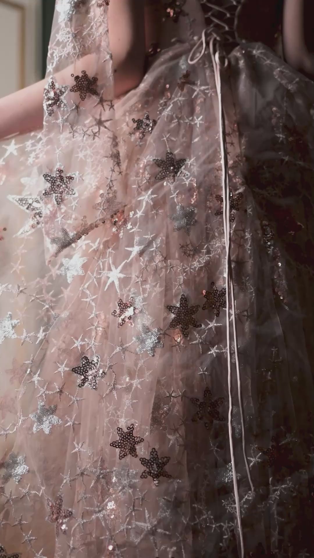 Star-crossed lovers is a term most of us know from Romeo and Juliet, which in it's simplest form is used to describe a love which is 'frustrated by the stars' and therefore doomed to fail. As in the case of Romeo and Juliet, their love seems fated from the beginning, and as most people know the story does in fact end in tragedy. Many people believe that the stars control our destiny. As such, we wanted the Star-crossed Lovers Gown to be a symbol of the fragile beauty and tragedy such prophesies can demand.