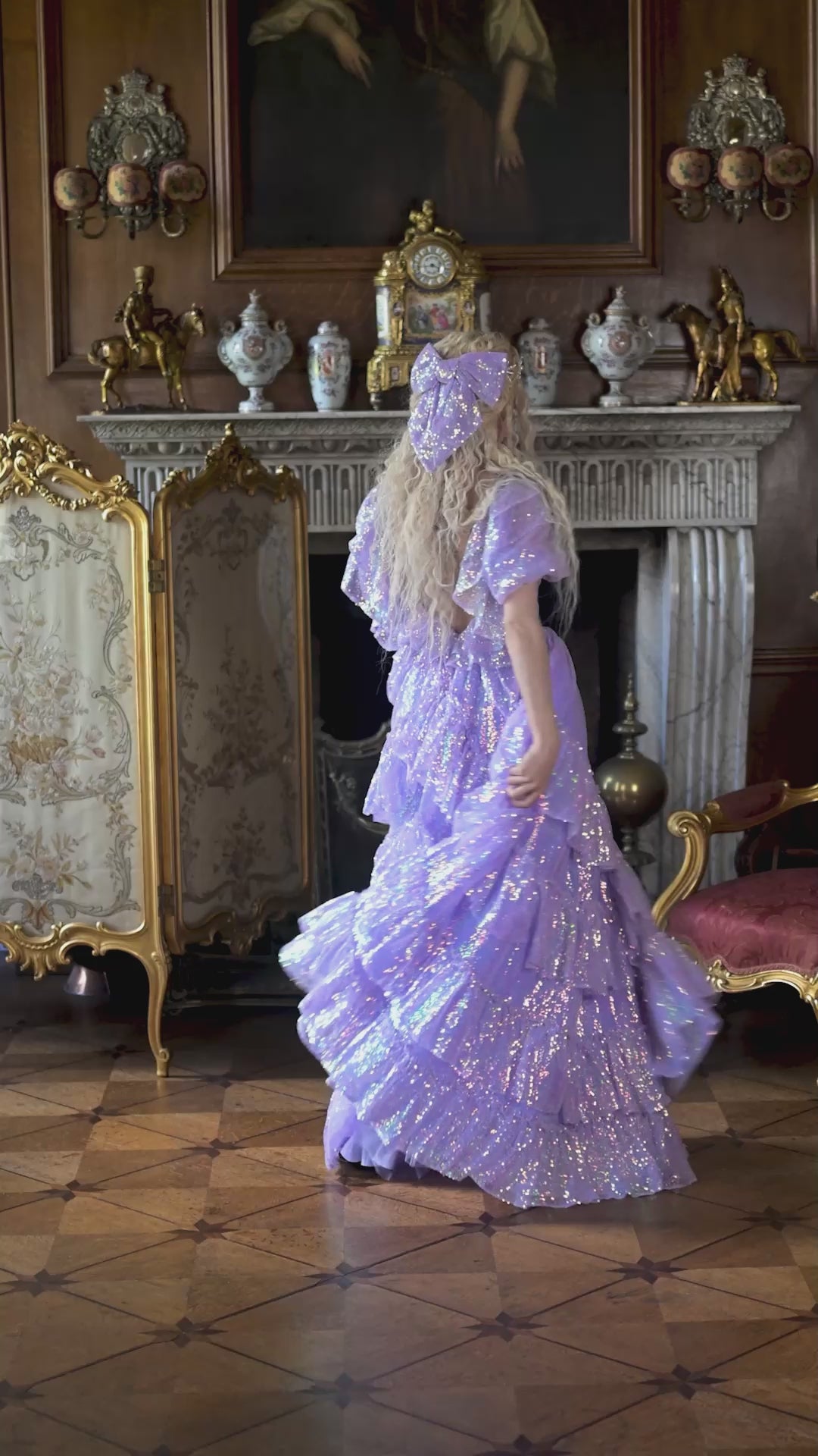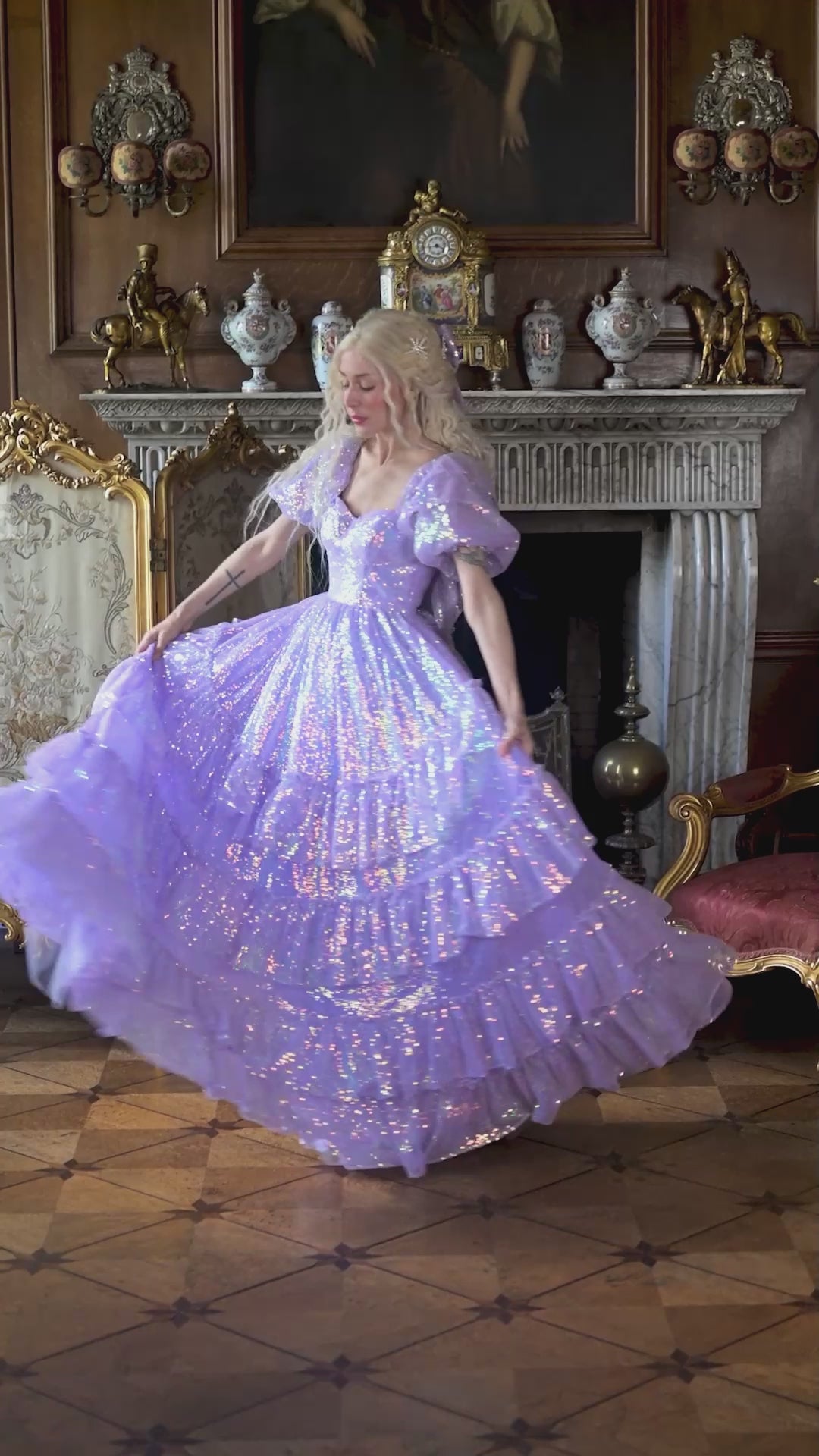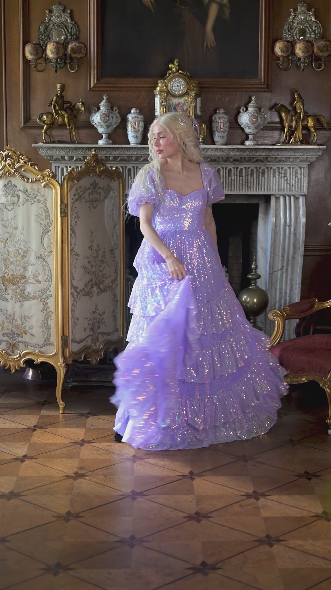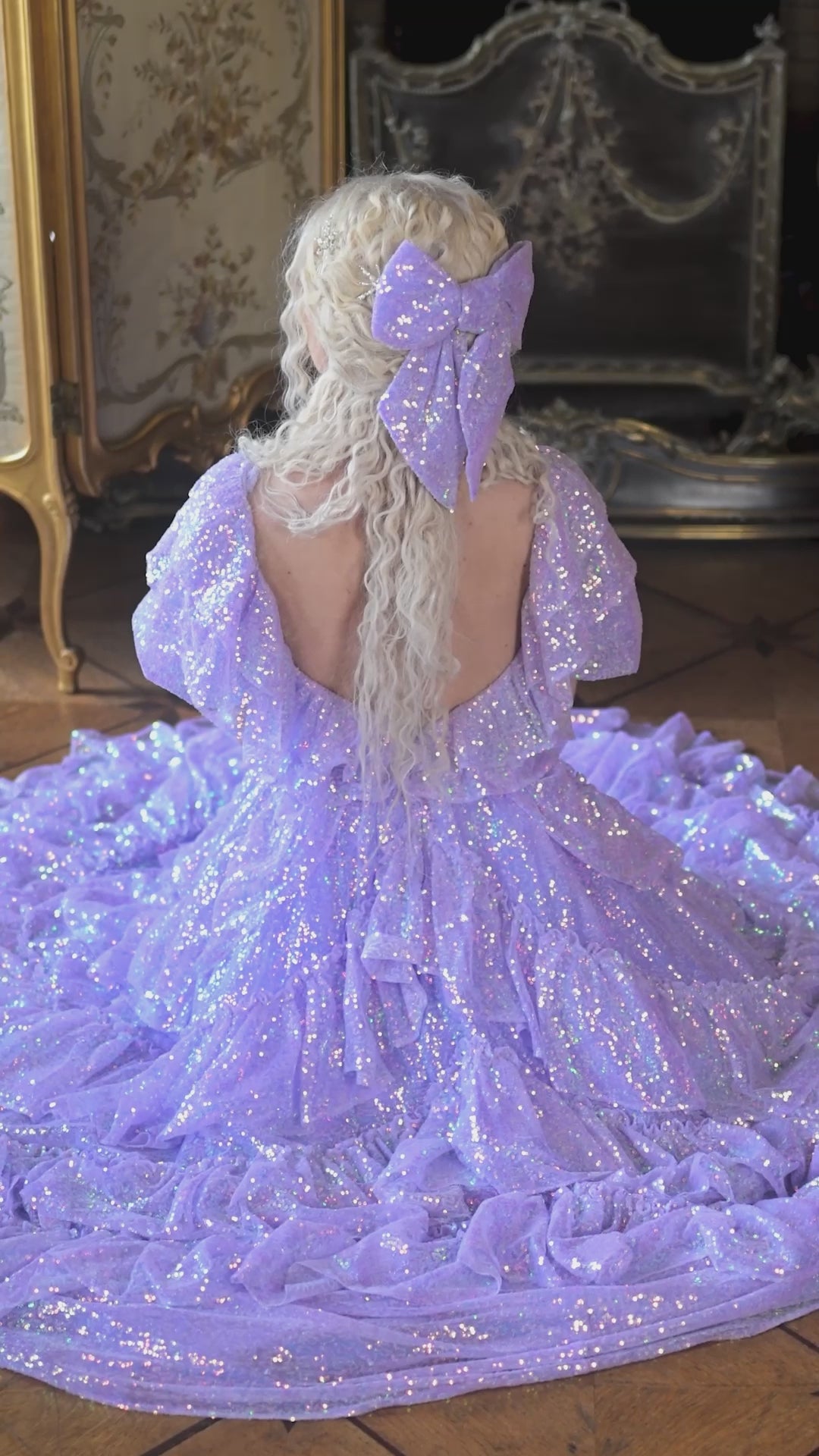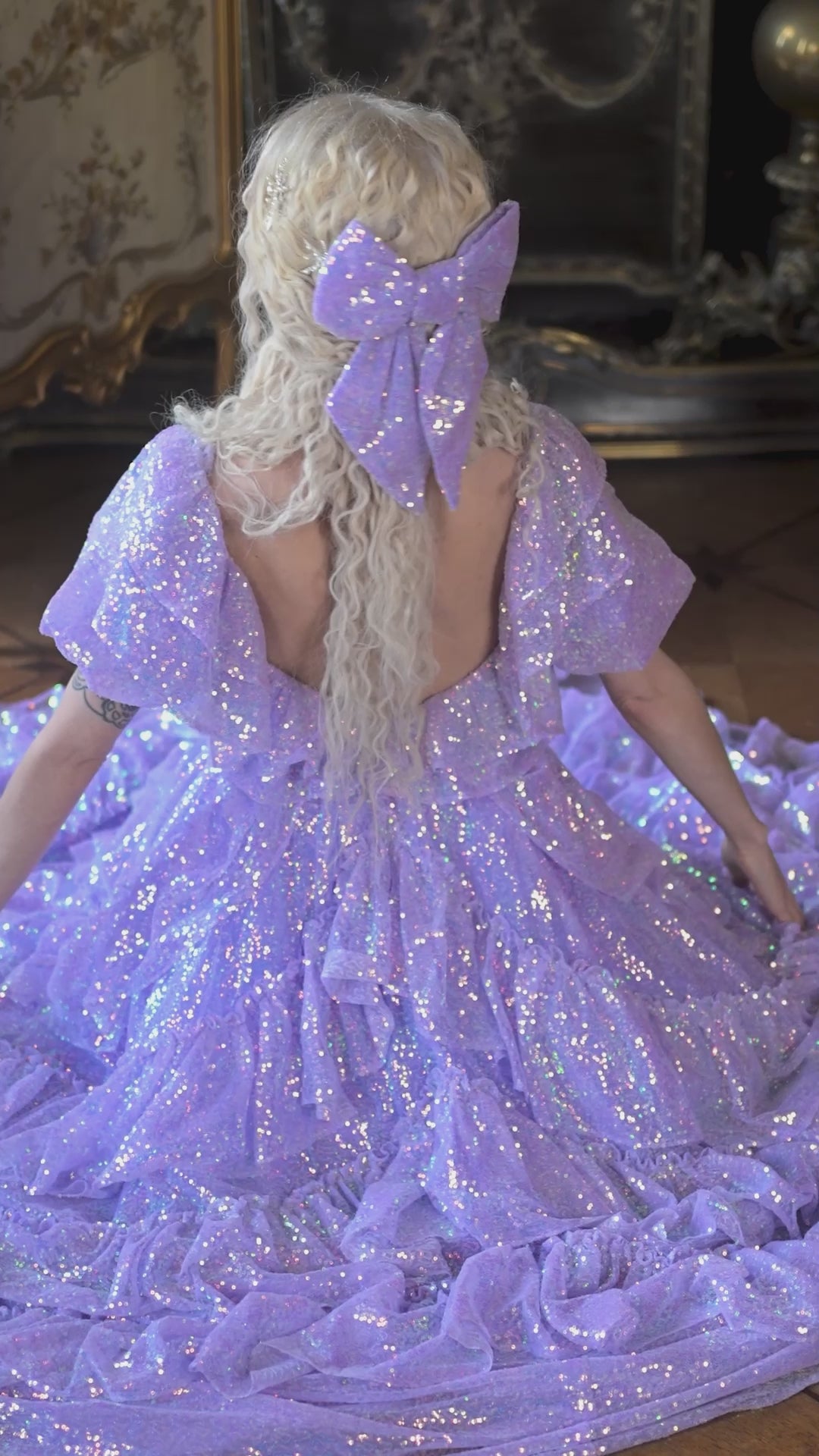 Make an unforgettable entrance in the enchanting Sugared Almond Odette Gown! This romantic dress features iridescent lavender sequins in sparkling shades of sugary confectionery, which twinkle luxuriously as your move. It feels as though you've escaped from the fairy forest, covered in their magical fairy dust, and are dancing through the woods under the moonlit sky!